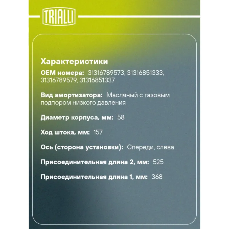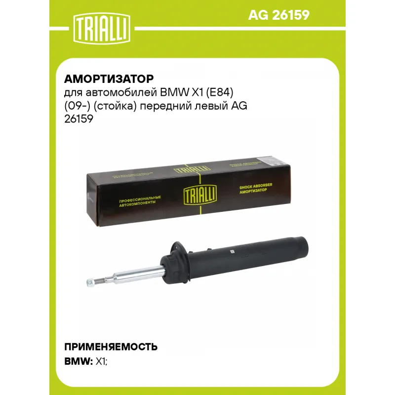 Амортизатор для автомобилей BMW X1 (E84) (09-) (стойка) передний левый Описание: Амортизатор AG 26159 бренда TRIALLI – это устройство для гашения колебаний (демпфирования) и поглощения толчков и ударов, действующих на раму. Особенности AG 26159: - Вид – Масляный с газовым подпором низкого давления; - Тип – Двухтрубный, гидравлический; Для крепления к деталям кузова или подвески используются крепления: верхнее Шток M12x1,5; и нижнее Зажим. Амортизатор в машину (стойка) имеет специальную площадку для установки пружины подвески. Совместим с: BMW X1.Подбор по VIN-номеру вашего автомобиля - через кнопку 'Задать вопрос'. Специалист проверит применяемость и ответит вам. Преимущества: - Инновационная технология производства; - Контроль качества каждой позиции по чертежам и с помощью 3D модели; - Сальник NOK; - Высокоэффективная система проектирования; - Гарантия до двух лет или 60 000 км пробега; Амортизаторы автомобильные существенно влияют на комфорт вождения, сокращая вибрации от неровностей дороги, что делает поездку более плавной и приятной. Регулярное и своевременное обслуживание амортизаторов помогут продлить их срок службы и обеспечить надёжную работу. Характеристики: Артикул: AG 26159 OEM номера: 31316789573, 31316851333, 31316789579, 31316851337 Товарная линейка: BLACK Парный товар: AG 26360 Количество на автомобиль: 1 Вид амортизатора: Масляный с газовым подпором низкого давления Тип верхнего крепления: Шток Тип нижнего крепления: Зажим Диаметр корпуса, мм: 58 Диаметр штока, мм: 25 Ход штока, мм: 157 Размер резьбы штока: M12x1,5 Тип амортизатора: Двухтрубный, гидравлический Ось (сторона установки): Спереди, слева Дополнительная информация: Упаковка изделия может отличаться от представленной на фото Присоединительная длина 2, мм: 525 Присоединительная длина 1, мм: 368 Сопутствующий товар: Амортизаторы: AG 26360, AG 26505 Гарантийный срок: 2 года/60 000 км Комплектация: Амортизатор (стойка) передний - 1 шт Гайка крепежная - 1 шт Гарантия: от 1 года.