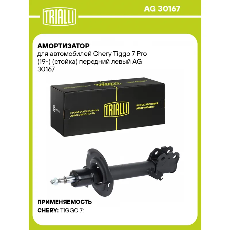 Амортизатор для автомобилей Chery Tiggo 7 Pro (19-) (стойка) передний левый Описание: Амортизатор AG 30167 бренда TRIALLI – это устройство для гашения колебаний (демпфирования) и поглощения толчков и ударов, действующих на раму. Особенности AG 30167: - Вид – Масляный с газовым подпором низкого давления; - Тип – Двухтрубный, гидравлический; Для крепления к деталям кузова или подвески используются крепления: верхнее Шток M12x1,25; и нижнее Скоба. Амортизатор в машину (стойка) имеет специальную площадку для установки пружины подвески. Совместим с: CHERY TIGGO 7.Подбор по VIN-номеру вашего автомобиля - через кнопку 'Задать вопрос'. Специалист проверит применяемость и ответит вам. Преимущества: - Инновационная технология производства; - Контроль качества каждой позиции по чертежам и с помощью 3D модели; - Сальник NOK; - Высокоэффективная система проектирования; - Гарантия до двух лет или 60 000 км пробега; Амортизаторы автомобильные существенно влияют на комфорт вождения, сокращая вибрации от неровностей дороги, что делает поездку более плавной и приятной. Регулярное и своевременное обслуживание амортизаторов помогут продлить их срок службы и обеспечить надёжную работу. Характеристики: Артикул: AG 30167 OEM номера: 202000359AA Товарная линейка: BLACK Парный товар: AG 30368 Количество на автомобиль: 1 Вид амортизатора: Масляный с газовым подпором низкого давления Тип верхнего крепления: Шток Тип нижнего крепления: Скоба Диаметр корпуса, мм: 50 Диаметр штока, мм: 22 Ход штока, мм: 208 Размер резьбы штока: M12x1,25 Тип амортизатора: Двухтрубный, гидравлический Ось (сторона установки): Спереди, слева Дополнительная информация: Упаковка изделия может отличаться от представленной на фото Присоединительная длина 2, мм: 610 Присоединительная длина 1, мм: 402 Сопутствующий товар: Амортизаторы: AG 30368 Гарантийный срок: 2 года/60 000 км Комплектация: Гайка крепежная - 1 шт Амортизатор (стойка) передний - 1 шт Гарантия: от 1 года.