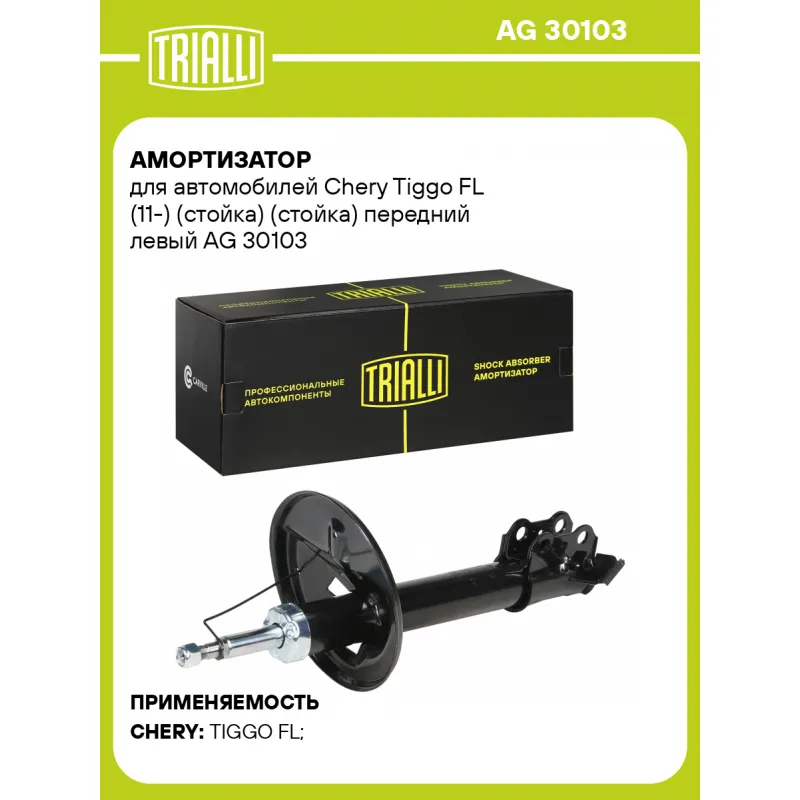 Амортизатор для автомобилей Chery Tiggo FL (11-) (стойка) (стойка) передний левый Описание: Амортизатор AG 30103 бренда TRIALLI – это устройство для гашения колебаний (демпфирования) и поглощения толчков и ударов, действующих на раму. Особенности AG 30103: - Вид – Масляный с газовым подпором низкого давления; - Тип – Двухтрубный, гидравлический; Для крепления к деталям кузова или подвески используются крепления: верхнее Шток M14x1,5; и нижнее Скоба. Амортизатор в машину (стойка) имеет специальную площадку для установки пружины подвески. Совместим с: CHERY TIGGO.Подбор по VIN-номеру вашего автомобиля - через кнопку 'Задать вопрос'. Специалист проверит применяемость и ответит вам. Преимущества: - Инновационная технология производства; - Контроль качества каждой позиции по чертежам и с помощью 3D модели; - Сальник NOK; - Высокоэффективная система проектирования; - Гарантия до двух лет или 60 000 км пробега; Амортизаторы автомобильные существенно влияют на комфорт вождения, сокращая вибрации от неровностей дороги, что делает поездку более плавной и приятной. Регулярное и своевременное обслуживание амортизаторов помогут продлить их срок службы и обеспечить надёжную работу. Характеристики: Артикул: AG 30103 OEM номера: T212905010 Товарная линейка: BLACK Парный товар: AG 30303 Количество на автомобиль: 1 Вид амортизатора: Масляный с газовым подпором низкого давления Тип верхнего крепления: Шток Тип нижнего крепления: Скоба Диаметр корпуса, мм: 50 Диаметр штока, мм: 22 Ход штока, мм: 209 Размер резьбы штока: M14x1,5 Тип амортизатора: Двухтрубный, гидравлический Ось (сторона установки): Спереди, слева Дополнительная информация: Упаковка изделия может отличаться от представленной на фото Присоединительная длина 2, мм: 594 Присоединительная длина 1, мм: 385 Сопутствующий товар: Амортизаторы: AG 30303 Гарантийный срок: 2 года/60 000 км Комплектация: Амортизатор (стойка) передний - 1 шт Гайка крепежная - 1 шт Гарантия: от 1 года.