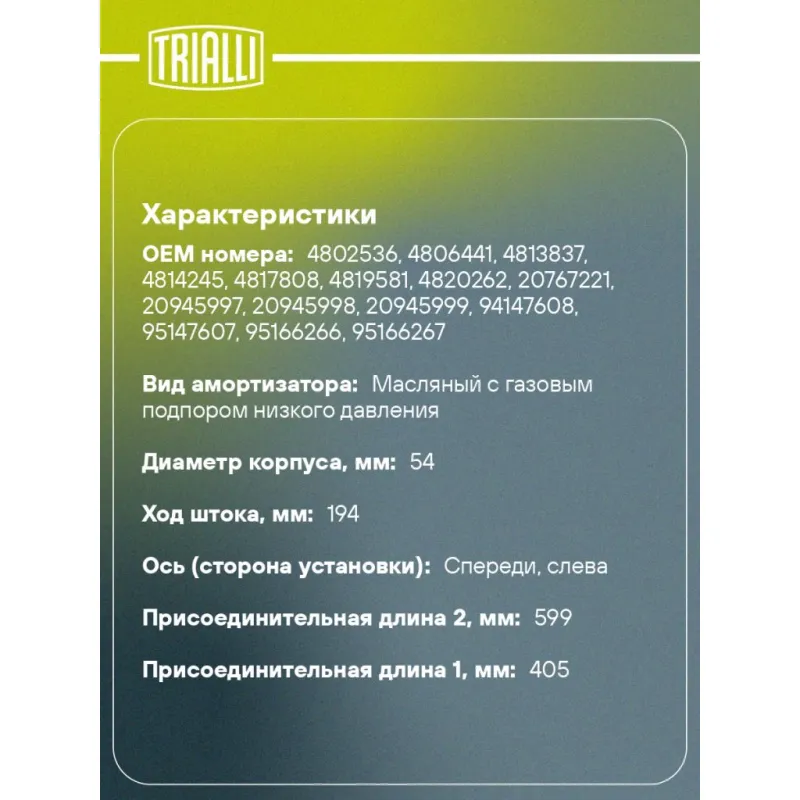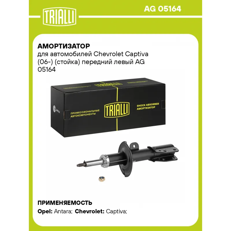 Амортизатор для автомобилей Chevrolet Captiva (06-) (стойка) передний левый Описание: Амортизатор AG 05164 бренда TRIALLI – это устройство для гашения колебаний (демпфирования) и поглощения толчков и ударов, действующих на раму. Особенности AG 05164: - Вид – Масляный с газовым подпором низкого давления; - Тип – Двухтрубный, гидравлический; Для крепления к деталям кузова или подвески используются крепления: верхнее Шток M14x1.5; и нижнее Скоба. Амортизатор в машину (стойка) имеет специальную площадку для установки пружины подвески. Совместим с: CHEVROLET CAPTIVA, DAEWOO WINSTORM, OPEL ANTARA.Подбор по VIN-номеру вашего автомобиля - через кнопку 'Задать вопрос'. Специалист проверит применяемость и ответит вам. Преимущества: - Инновационная технология производства; - Контроль качества каждой позиции по чертежам и с помощью 3D модели; - Сальник NOK; - Высокоэффективная система проектирования; - Гарантия до двух лет или 60 000 км пробега; Амортизаторы автомобильные существенно влияют на комфорт вождения, сокращая вибрации от неровностей дороги, что делает поездку более плавной и приятной. Регулярное и своевременное обслуживание амортизаторов помогут продлить их срок службы и обеспечить надёжную работу. Характеристики: Артикул: AG 05164 OEM номера: 4802536, 4806441, 4813837, 4814245, 4817808, 4819581, 4820262, 20767221, 20945997, 20945998, 20945999, 94147608, 95147607, 95166266, 95166267, 95166268, 95948811, 95948815, 96626398, 96809737, 96858475, 96863983, 96858477, 96626303, 95948809, 96858479 Товарная линейка: BLACK Парный товар: AG 05365 Количество на автомобиль: 1 Вид амортизатора: Масляный с газовым подпором низкого давления Тип верхнего крепления: Шток Тип нижнего крепления: Скоба Диаметр корпуса, мм: 54 Диаметр штока, мм: 25 Ход штока, мм: 194 Размер резьбы штока: M14x1.5 Тип амортизатора: Двухтрубный, гидравлический Ось (сторона установки): Спереди, слева Дополнительная информация: Упаковка изделия может отличаться от представленной на фото Присоединительная длина 2, мм: 599 Присоединительная длина 1, мм: 405 Сопутствующий товар: Амортизаторы: AG 05365, AG 05510 Гарантийный срок: 2 года/60 000 км Подходит для авто: Opel Antara (06-), Antara (06-) Chevrolet Captiva (06-), Captiva (11-), Captiva (11-) Для проверки применяемости отправьте VIN автомобиля через вкладку "Есть вопросы о товаре?" Комплектация: Амортизатор (стойка) передний - 1 шт Гайка крепежная - 1 шт Гарантия: от 1 года.