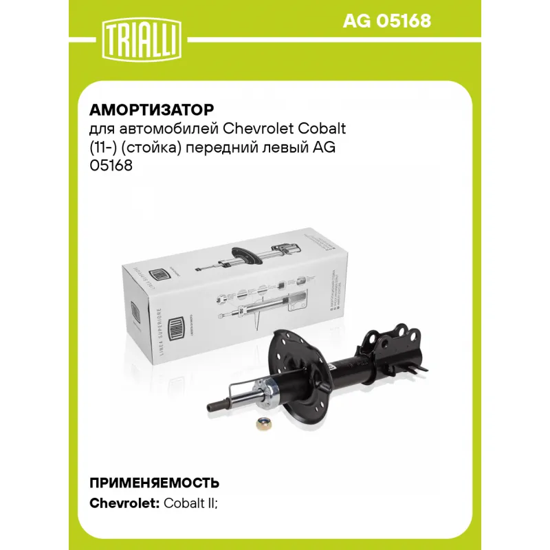 Амортизатор для автомобилей Chevrolet Cobalt (11-) (стойка) передний левый Описание: Амортизатор AG 05168 бренда TRIALLI – это устройство для гашения колебаний (демпфирования) и поглощения толчков и ударов, действующих на раму. Особенности AG 05168: - Вид – Масляный с газовым подпором низкого давления; - Тип – Двухтрубный, гидравлический; Для крепления к деталям кузова или подвески используются крепления: верхнее Шток M14x1.5; и нижнее Скоба. Амортизатор в машину (стойка) имеет специальную площадку для установки пружины подвески. Совместим с: CHEVROLET COBALT, RAVON R4.Подбор по VIN-номеру вашего автомобиля - через кнопку 'Задать вопрос'. Специалист проверит применяемость и ответит вам. Преимущества: - Инновационная технология производства; - Контроль качества каждой позиции по чертежам и с помощью 3D модели; - Сальник NOK; - Высокоэффективная система проектирования; - Гарантия до двух лет или 60 000 км пробега; Амортизаторы автомобильные существенно влияют на комфорт вождения, сокращая вибрации от неровностей дороги, что делает поездку более плавной и приятной. Регулярное и своевременное обслуживание амортизаторов помогут продлить их срок службы и обеспечить надёжную работу. Характеристики: Артикул: AG 05168 OEM номера: 52024166, 52024164, 52016637 Товарная линейка: BLACK Парный товар: AG 05369 Количество на автомобиль: 1 Вид амортизатора: Масляный с газовым подпором низкого давления Тип верхнего крепления: Шток Тип нижнего крепления: Скоба Диаметр корпуса, мм: 48,5 Диаметр штока, мм: 20 Ход штока, мм: 156 Размер резьбы штока: M14x1.5 Тип амортизатора: Двухтрубный, гидравлический Ось (сторона установки): Спереди, слева Дополнительная информация: Упаковка изделия может отличаться от представленной на фото Присоединительная длина 2, мм: 521 Присоединительная длина 1, мм: 365 Сопутствующий товар: Ремонтные комплекты амортизаторов: BC 1848, BCS 1848 Сопутствующий товар: Амортизаторы: AG 05369, AG 05512 Гарантийный срок: 2 года/60 000 км Подходит для авто: Chevrolet Cobalt II (11-) Для проверки применяемости отправьте VIN автомобиля через вкладку "Есть вопросы о товаре?" Комплектация: Гайка крепежная - 1 шт Амортизатор (стойка) передний - 1 шт Гарантия: от 1 года.