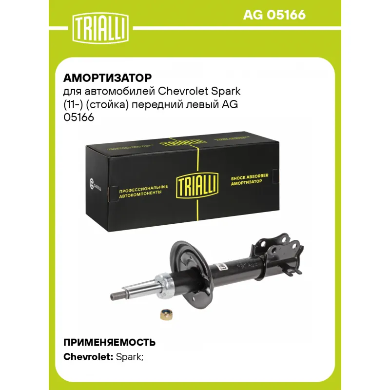 Амортизатор для автомобилей Chevrolet Spark (11-) (стойка) передний левый Описание: Амортизатор AG 05166 бренда TRIALLI – это устройство для гашения колебаний (демпфирования) и поглощения толчков и ударов, действующих на раму. Особенности AG 05166: - Вид – Масляный с газовым подпором низкого давления; - Тип – Двухтрубный, гидравлический; Для крепления к деталям кузова или подвески используются крепления: верхнее Шток M14x1.5; и нижнее Скоба. Амортизатор в машину (стойка) имеет специальную площадку для установки пружины подвески. Совместим с: CHEVROLET SPARK, RAVON R2.Подбор по VIN-номеру вашего автомобиля - через кнопку 'Задать вопрос'. Специалист проверит применяемость и ответит вам. Преимущества: - Инновационная технология производства; - Контроль качества каждой позиции по чертежам и с помощью 3D модели; - Сальник NOK; - Высокоэффективная система проектирования; - Гарантия до двух лет или 60 000 км пробега; Амортизаторы автомобильные существенно влияют на комфорт вождения, сокращая вибрации от неровностей дороги, что делает поездку более плавной и приятной. Регулярное и своевременное обслуживание амортизаторов помогут продлить их срок службы и обеспечить надёжную работу. Характеристики: Артикул: AG 05166 OEM номера: 95025460, 95025462, 95032445, 95032447, 96071861, 96682475 Товарная линейка: BLACK Парный товар: AG 05367 Количество на автомобиль: 1 Вид амортизатора: Масляный с газовым подпором низкого давления Тип верхнего крепления: Шток Тип нижнего крепления: Скоба Диаметр корпуса, мм: 45 Диаметр штока, мм: 20 Ход штока, мм: 146 Размер резьбы штока: M14x1.5 Тип амортизатора: Двухтрубный, гидравлический Ось (сторона установки): Спереди, слева Дополнительная информация: Упаковка изделия может отличаться от представленной на фото Присоединительная длина 2, мм: 492 Присоединительная длина 1, мм: 346 Сопутствующий товар: Ремонтные комплекты амортизаторов: BC 1848, BCS 1848 Сопутствующий товар: Амортизаторы: AG 05367, AG 05511 Гарантийный срок: 2 года/60 000 км Подходит для авто: Chevrolet Spark (09-) Для проверки применяемости отправьте VIN автомобиля через вкладку "Есть вопросы о товаре?" Комплектация: Амортизатор (стойка) передний - 1 шт Гайка крепежная - 1 шт Гарантия: от 1 года.