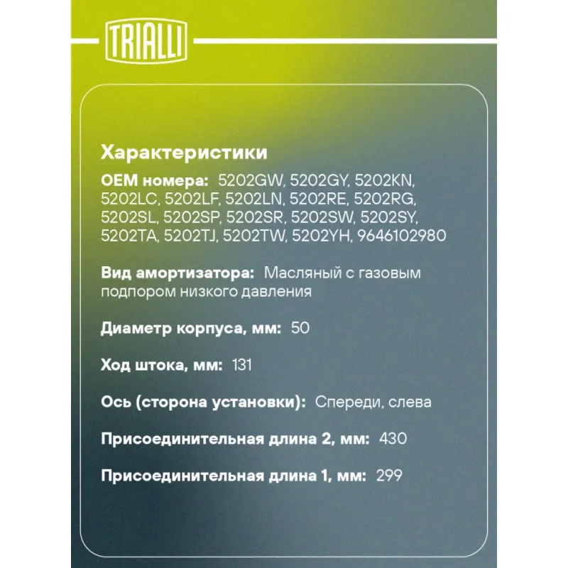 Амортизатор для автомобилей Citroen C3 (02-) (стойка) передний левый Описание: Амортизатор AG 20158 бренда TRIALLI – это устройство для гашения колебаний (демпфирования) и поглощения толчков и ударов, действующих на раму. Особенности AG 20158: - Вид – Масляный с газовым подпором низкого давления; - Тип – Двухтрубный, гидравлический; Для крепления к деталям кузова или подвески используются крепления: верхнее Шток M14x1.5; и нижнее Зажим. Амортизатор в машину (стойка) имеет специальную площадку для установки пружины подвески. Совместим с: CITROEN C3, C2, PEUGEOT 1007.Подбор по VIN-номеру вашего автомобиля - через кнопку 'Задать вопрос'. Специалист проверит применяемость и ответит вам. Преимущества: - Инновационная технология производства; - Контроль качества каждой позиции по чертежам и с помощью 3D модели; - Сальник NOK; - Высокоэффективная система проектирования; - Гарантия до двух лет или 60 000 км пробега; Амортизаторы автомобильные существенно влияют на комфорт вождения, сокращая вибрации от неровностей дороги, что делает поездку более плавной и приятной. Регулярное и своевременное обслуживание амортизаторов помогут продлить их срок службы и обеспечить надёжную работу. Характеристики: Артикул: AG 20158 OEM номера: 5202GW, 5202GY, 5202KN, 5202LC, 5202LF, 5202LN, 5202RE, 5202RG, 5202SL, 5202SP, 5202SR, 5202SW, 5202SY, 5202TA, 5202TJ, 5202TW, 5202YH, 9646102980, 9646492080, 9649125680, 9649126080, 9649468480, 9650805380, 9650805580 Товарная линейка: BLACK Парный товар: AG 20359 Количество на автомобиль: 1 Вид амортизатора: Масляный с газовым подпором низкого давления Тип верхнего крепления: Шток Тип нижнего крепления: Зажим Диаметр корпуса, мм: 50 Диаметр штока, мм: 22 Ход штока, мм: 131 Размер резьбы штока: M14x1.5 Тип амортизатора: Двухтрубный, гидравлический Ось (сторона установки): Спереди, слева Дополнительная информация: Упаковка изделия может отличаться от представленной на фото Присоединительная длина 2, мм: 430 Присоединительная длина 1, мм: 299 Сопутствующий товар: Ремонтные комплекты амортизаторов: BC 1948, BCS 2048 Сопутствующий товар: Амортизаторы: AG 20359, AG 20505 Гарантийный срок: 2 года/60 000 км Подходит для авто: Citroen C3 (02-), C2 (03-) Peugeot 1007 (05-) Для проверки применяемости отправьте VIN автомобиля через вкладку "Есть вопросы о товаре?" Комплектация: Амортизатор (стойка) передний - 1 шт Гайка крепежная - 1 шт Гарантия: от 1 года.