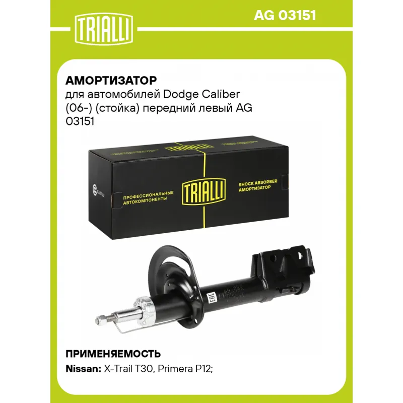 Амортизатор для автомобилей Dodge Caliber (06-) (стойка) передний левый Описание: Амортизатор AG 03151 бренда TRIALLI – это устройство для гашения колебаний (демпфирования) и поглощения толчков и ударов, действующих на раму. Особенности AG 03151: - Вид – Масляный с газовым подпором низкого давления; - Тип – Двухтрубный, гидравлический; Для крепления к деталям кузова или подвески используются крепления: верхнее Шток M12x1.25; и нижнее Скоба. Амортизатор в машину (стойка) имеет специальную площадку для установки пружины подвески. Совместим с: DODGE CALIBER, NISSAN PRIMERA, X-TRAIL.Подбор по VIN-номеру вашего автомобиля - через кнопку 'Задать вопрос'. Специалист проверит применяемость и ответит вам. Преимущества: - Инновационная технология производства; - Контроль качества каждой позиции по чертежам и с помощью 3D модели; - Сальник NOK; - Высокоэффективная система проектирования; - Гарантия до двух лет или 60 000 км пробега; Амортизаторы автомобильные существенно влияют на комфорт вождения, сокращая вибрации от неровностей дороги, что делает поездку более плавной и приятной. Регулярное и своевременное обслуживание амортизаторов помогут продлить их срок службы и обеспечить надёжную работу. Характеристики: Артикул: AG 03151 OEM номера: 5105311AF, 5105311AG, 5105311AH Товарная линейка: BLACK Парный товар: AG 03352 Количество на автомобиль: 1 Вид амортизатора: Масляный с газовым подпором низкого давления Тип верхнего крепления: Шток Тип нижнего крепления: Скоба Диаметр корпуса, мм: 51 Диаметр штока, мм: 22 Ход штока, мм: 166 Размер резьбы штока: M12x1.25 Тип амортизатора: Двухтрубный, гидравлический Ось (сторона установки): Спереди, слева Присоединительная длина 2, мм: 584 Присоединительная длина 1, мм: 418 Сопутствующий товар: Ремонтные комплекты амортизаторов: BC 1948, BCS 2048 Сопутствующий товар: Амортизаторы: AG 03352, AG 03517 Гарантийный срок: 2 года/60 000 км Подходит для авто: Nissan X-Trail T30 (01-), Primera P12 (02-), X-Trail T30 (01-), Primera P12 (02-) Для проверки применяемости отправьте VIN автомобиля через вкладку "Есть вопросы о товаре?" Комплектация: Амортизатор (стойка) передний - 1 шт Гайка крепежная - 1 шт Гарантия: от 1 года.