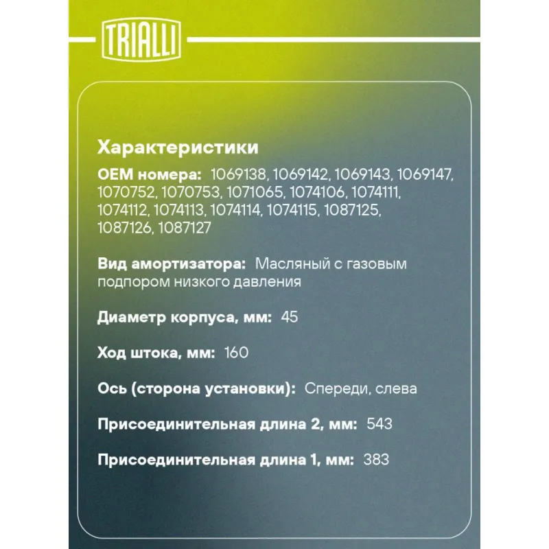 Амортизатор для автомобилей Ford Focus I (98-) (стойка) передний левый Описание: Амортизатор AG 10167 бренда TRIALLI – это устройство для гашения колебаний (демпфирования) и поглощения толчков и ударов, действующих на раму. Особенности AG 10167: - Вид – Масляный с газовым подпором низкого давления; - Тип – Двухтрубный, гидравлический; Для крепления к деталям кузова или подвески используются крепления: верхнее Шток M12x1.25; и нижнее Зажим. Амортизатор в машину (стойка) имеет специальную площадку для установки пружины подвески. Совместим с: FORD FOCUS.Подбор по VIN-номеру вашего автомобиля - через кнопку 'Задать вопрос'. Специалист проверит применяемость и ответит вам. Преимущества: - Инновационная технология производства; - Контроль качества каждой позиции по чертежам и с помощью 3D модели; - Сальник NOK; - Высокоэффективная система проектирования; - Гарантия до двух лет или 60 000 км пробега; Амортизаторы автомобильные существенно влияют на комфорт вождения, сокращая вибрации от неровностей дороги, что делает поездку более плавной и приятной. Регулярное и своевременное обслуживание амортизаторов помогут продлить их срок службы и обеспечить надёжную работу. Характеристики: Артикул: AG 10167 OEM номера: 1069138, 1069142, 1069143, 1069147, 1070752, 1070753, 1071065, 1074106, 1074111, 1074112, 1074113, 1074114, 1074115, 1087125, 1087126, 1087127, 1088227, 1088231, 1088234, 1088237, 1088238, 1111009, 1111010, 1111011, 1111012, 1111013, 1111014, 1112670, 1112672, 1143218, 1143219, 1143220, 1149976, 1149981, 1202012, 1202260, 1202275, 1202327, 1202334, 1202343, 1202490, 1202521, 1202529, 1202559, 1202637, 1202643, 1202648, 1214022, 1365744, 4417814, 98AG18146AK, 98AG18146BK, 98AG18146CL, 98AG18146DK, 98AG18146EF, 98AG18146FF, 98AG18146HG, 98AG18146JD, 98AG18146KC, 98AG18146LE, 98AG18146ME, 98AG18146NC, 98AG18K001CK, 98AG18K001EE, 98AG18K001FE, 98AG18K001FF, 98AG18K001HE, 98AG18K001HF, 98AG18K001JB, 98AG18K001JC, 98AG18K001JD, 98AG18K001KB, 98AG18K001KC, 98AG18K001LC, 98AG18K001MC, 98AG18K001MD, 98AG18K001ME, 98AG18K001NA, 98AG18K001NB, 98AG18K001NC, 98AX18K001CK, 98AX18K001EE, 98AX18K001FE, 98AX18K001HE, 98AX18K001JB, 98AX18K001KB, 98AX18K001LC, 98AX18K001LD, 98AX18K001MC, 98AX18K001MD, 98AX18K001NA, 98AX18045MD, 98AX18045NA Товарная линейка: BLACK Парный товар: AG 10368 Количество на автомобиль: 1 Вид амортизатора: Масляный с газовым подпором низкого давления Тип верхнего крепления: Шток Тип нижнего крепления: Зажим Диаметр корпуса, мм: 45 Диаметр штока, мм: 20 Ход штока, мм: 160 Размер резьбы штока: M12x1.25 Тип амортизатора: Двухтрубный, гидравлический Ось (сторона установки): Спереди, слева Дополнительная информация: Упаковка изделия может отличаться от представленной на фото Присоединительная длина 2, мм: 543 Присоединительная длина 1, мм: 383 Сопутствующий товар: Ремонтные комплекты амортизаторов: BC 1848, BCS 1848,BCS 10102 Сопутствующий товар: Амортизаторы: AG 10368, AG 10511, AG 10510 Гарантийный срок: 2 года/60 000 км Подходит для авто: Ford Focus I (98-) Для проверки применяемости отправьте VIN автомобиля через вкладку "Есть вопросы о товаре?" Комплектация: Амортизатор (стойка) передний - 1 шт Гайка крепежная - 1 шт Гарантия: от 1 года.