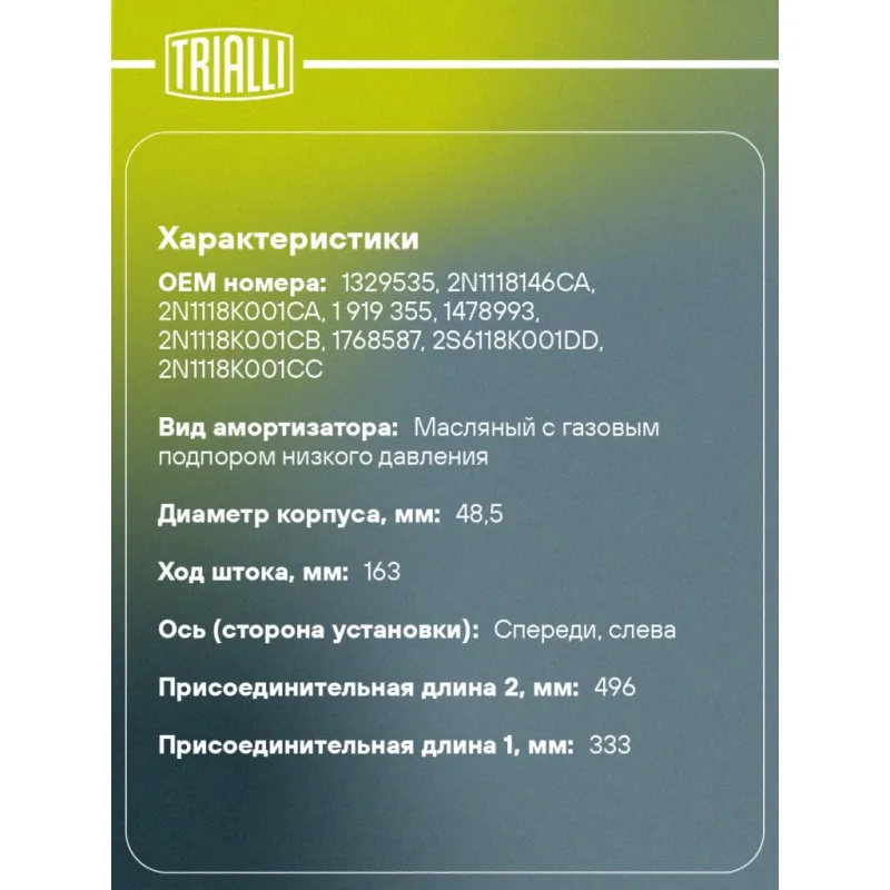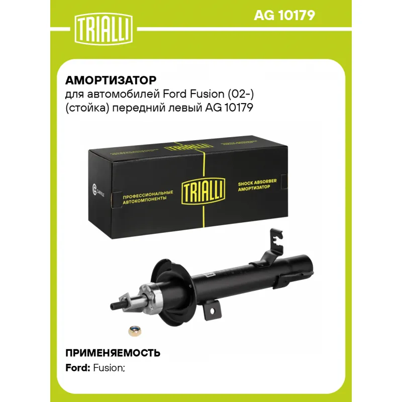 Амортизатор для автомобилей Ford Fusion (02-) (стойка) передний левый Описание: Амортизатор AG 10179 бренда TRIALLI – это устройство для гашения колебаний (демпфирования) и поглощения толчков и ударов, действующих на раму. Особенности AG 10179: - Вид – Масляный с газовым подпором низкого давления; - Тип – Двухтрубный, гидравлический; Для крепления к деталям кузова или подвески используются крепления: верхнее Шток M12x1.25; и нижнее Зажим. Амортизатор в машину (стойка) имеет специальную площадку для установки пружины подвески. Совместим с: FORD FUSION.Подбор по VIN-номеру вашего автомобиля - через кнопку 'Задать вопрос'. Специалист проверит применяемость и ответит вам. Преимущества: - Инновационная технология производства; - Контроль качества каждой позиции по чертежам и с помощью 3D модели; - Сальник NOK; - Высокоэффективная система проектирования; - Гарантия до двух лет или 60 000 км пробега; Амортизаторы автомобильные существенно влияют на комфорт вождения, сокращая вибрации от неровностей дороги, что делает поездку более плавной и приятной. Регулярное и своевременное обслуживание амортизаторов помогут продлить их срок службы и обеспечить надёжную работу. Характеристики: Артикул: AG 10179 OEM номера: 1329535, 2N1118146CA, 2N1118K001CA, 1 919 355, 1478993, 2N1118K001CB, 1768587, 2S6118K001DD, 2N1118K001CC Товарная линейка: BLACK Парный товар: AG 10380 Количество на автомобиль: 1 Вид амортизатора: Масляный с газовым подпором низкого давления Тип верхнего крепления: Шток Тип нижнего крепления: Зажим Диаметр корпуса, мм: 48,5 Диаметр штока, мм: 20 Ход штока, мм: 163 Размер резьбы штока: M12x1.25 Тип амортизатора: Двухтрубный, гидравлический Ось (сторона установки): Спереди, слева Дополнительная информация: Для а/м с бочкообразными пружинами с 01.04 г.в. Присоединительная длина 2, мм: 496 Присоединительная длина 1, мм: 333 Сопутствующий товар: Ремонтные комплекты амортизаторов: BC 1848, BCS 1848,BCS 1884 Сопутствующий товар: Амортизаторы: AG 10380, AG 10519 Гарантийный срок: 2 года/60 000 км Подходит для авто: Ford Fusion (02-), Fusion (02-) Для проверки применяемости отправьте VIN автомобиля через вкладку "Есть вопросы о товаре?" Комплектация: Амортизатор (стойка) передний - 1 шт Гайка крепежная - 1 шт Гарантия: от 1 года.