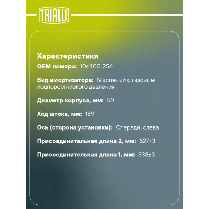 Амортизатор для автомобилей Geely Emgrand EC7 (09-) (стойка) передний левый Описание: Амортизатор AG 30151 бренда TRIALLI – это устройство для гашения колебаний (демпфирования) и поглощения толчков и ударов, действующих на раму. Особенности AG 30151: - Вид – Масляный с газовым подпором низкого давления; - Тип – Двухтрубный, гидравлический; Для крепления к деталям кузова или подвески используются крепления: верхнее Шток M14x1.5; и нижнее Скоба. Амортизатор в машину (стойка) имеет специальную площадку для установки пружины подвески. Совместим с: GEELY EMGRAND EC7/7.Подбор по VIN-номеру вашего автомобиля - через кнопку 'Задать вопрос'. Специалист проверит применяемость и ответит вам. Преимущества: - Инновационная технология производства; - Контроль качества каждой позиции по чертежам и с помощью 3D модели; - Сальник NOK; - Высокоэффективная система проектирования; - Гарантия до двух лет или 60 000 км пробега; Амортизаторы автомобильные существенно влияют на комфорт вождения, сокращая вибрации от неровностей дороги, что делает поездку более плавной и приятной. Регулярное и своевременное обслуживание амортизаторов помогут продлить их срок службы и обеспечить надёжную работу. Характеристики: Артикул: AG 30151 OEM номера: 1064001256 Товарная линейка: BLACK Парный товар: AG 30352 Количество на автомобиль: 1 Вид амортизатора: Масляный с газовым подпором низкого давления Тип верхнего крепления: Шток Тип нижнего крепления: Скоба Диаметр корпуса, мм: 50 Диаметр штока, мм: 20 Ход штока, мм: 189 Размер резьбы штока: M14x1.5 Тип амортизатора: Двухтрубный, гидравлический Ось (сторона установки): Спереди, слева Дополнительная информация: Упаковка изделия может отличаться от представленной на фото Присоединительная длина 2, мм: 527±3 Присоединительная длина 1, мм: 338±3 Сопутствующий товар: Амортизаторы: AG 30352 Гарантийный срок: 2 года/60 000 км Подходит для авто: Geely Emgrand EC7 (09-) Для проверки применяемости отправьте VIN автомобиля через вкладку "Есть вопросы о товаре?" Комплектация: Амортизатор (стойка) передний - 1 шт Гайка крепежная - 1 шт Гарантия: от 1 года.