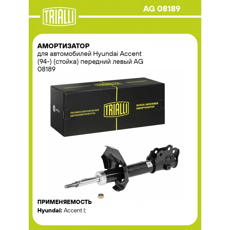 Амортизатор для автомобилей Hyundai Accent (94-) (стойка) передний левый Описание: Амортизатор AG 08189 бренда TRIALLI – это устройство для гашения колебаний (демпфирования) и поглощения толчков и ударов, действующих на раму. Особенности AG 08189: - Вид – Масляный с газовым подпором низкого давления; - Тип – Двухтрубный, гидравлический; Для крепления к деталям кузова или подвески используются крепления: верхнее Шток M12x1.25; и нижнее Скоба. Амортизатор в машину (стойка) имеет специальную площадку для установки пружины подвески. Совместим с: HYUNDAI ACCENT.Подбор по VIN-номеру вашего автомобиля - через кнопку 'Задать вопрос'. Специалист проверит применяемость и ответит вам. Преимущества: - Инновационная технология производства; - Контроль качества каждой позиции по чертежам и с помощью 3D модели; - Сальник NOK; - Высокоэффективная система проектирования; - Гарантия до двух лет или 60 000 км пробега; Амортизаторы автомобильные существенно влияют на комфорт вождения, сокращая вибрации от неровностей дороги, что делает поездку более плавной и приятной. Регулярное и своевременное обслуживание амортизаторов помогут продлить их срок службы и обеспечить надёжную работу. Характеристики: Артикул: AG 08189 OEM номера: 5465122000, 5465122050, 5465122051, 5465122100, 5465122102, 5465122150, 5465122152, 5465122200, 5465122201, 5465122250, 5465122650, 5465122651, 5465122951, 5465122952 Товарная линейка: BLACK Парный товар: AG 08390 Количество на автомобиль: 1 Вид амортизатора: Масляный с газовым подпором низкого давления Тип верхнего крепления: Шток Тип нижнего крепления: Скоба Диаметр корпуса, мм: 45 Диаметр штока, мм: 20 Ход штока, мм: 156 Размер резьбы штока: M12x1.25 Тип амортизатора: Двухтрубный, гидравлический Ось (сторона установки): Спереди, слева Дополнительная информация: Упаковка изделия может отличаться от представленной на фото Присоединительная длина 2, мм: 474 Присоединительная длина 1, мм: 318 Сопутствующий товар: Ремонтные комплекты амортизаторов: BC 1848, BCS 1848 Сопутствующий товар: Амортизаторы: AG 08390, AG 08233, AG 08434 Гарантийный срок: 2 года/60 000 км Подходит для авто: Hyundai Accent I (94-) Для проверки применяемости отправьте VIN автомобиля через вкладку "Есть вопросы о товаре?" Комплектация: Амортизатор (стойка) передний - 1 шт Гайка крепежная - 1 шт Гарантия: от 1 года.