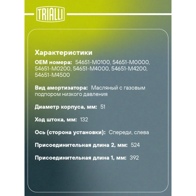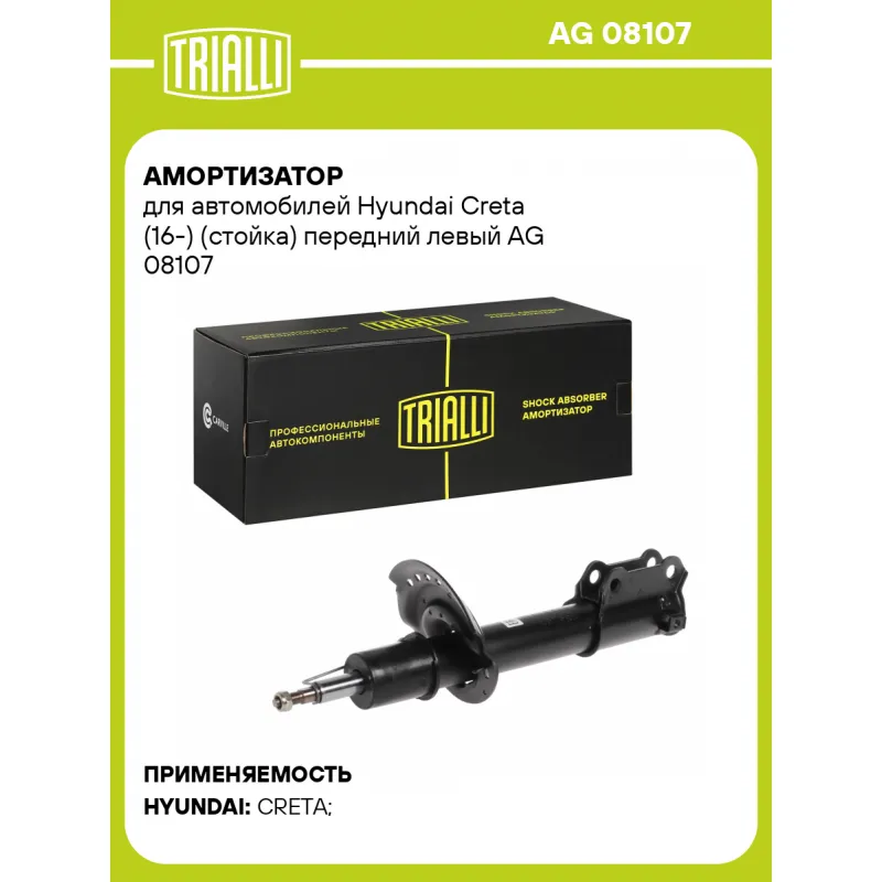 Амортизатор для автомобилей Hyundai Creta (16-) (стойка) передний левый Описание: Амортизатор AG 08107 бренда TRIALLI – это устройство для гашения колебаний (демпфирования) и поглощения толчков и ударов, действующих на раму. Особенности AG 08107: - Вид – Масляный с газовым подпором низкого давления; - Тип – Двухтрубный, гидравлический; Для крепления к деталям кузова или подвески используются крепления: верхнее Шток M12x1,25; и нижнее Скоба. Амортизатор в машину (стойка) имеет специальную площадку для установки пружины подвески. Совместим с: HYUNDAI CRETA.Подбор по VIN-номеру вашего автомобиля - через кнопку 'Задать вопрос'. Специалист проверит применяемость и ответит вам. Преимущества: - Инновационная технология производства; - Контроль качества каждой позиции по чертежам и с помощью 3D модели; - Сальник NOK; - Высокоэффективная система проектирования; - Гарантия до двух лет или 60 000 км пробега; Амортизаторы автомобильные существенно влияют на комфорт вождения, сокращая вибрации от неровностей дороги, что делает поездку более плавной и приятной. Регулярное и своевременное обслуживание амортизаторов помогут продлить их срок службы и обеспечить надёжную работу. Характеристики: Артикул: AG 08107 OEM номера: 54651-M0100, 54651-M0000, 54651-M0200, 54651-M4000, 54651-M4200, 54651-M4500 Товарная линейка: BLACK Парный товар: AG 08308 Количество на автомобиль: 1 Вид амортизатора: Масляный с газовым подпором низкого давления Тип верхнего крепления: Шток Тип нижнего крепления: Скоба Диаметр корпуса, мм: 51 Диаметр штока, мм: 22 Ход штока, мм: 132 Размер резьбы штока: M12x1,25 Тип амортизатора: Двухтрубный, гидравлический Ось (сторона установки): Спереди, слева Присоединительная длина 2, мм: 524 Сопутствующий товар: Опоры передних стоек: SA 0870 Присоединительная длина 1, мм: 392 Сопутствующий товар: Ремонтные комплекты амортизаторов: BC 1948, BCS 2048 Сопутствующий товар: Амортизаторы: AG 08308, AG 08540, AG 08560 Гарантийный срок: 2 года/60 000 км Комплектация: Амортизатор (стойка) передний - 1 шт Гайка крепежная - 1 шт Гарантия: от 1 года.
