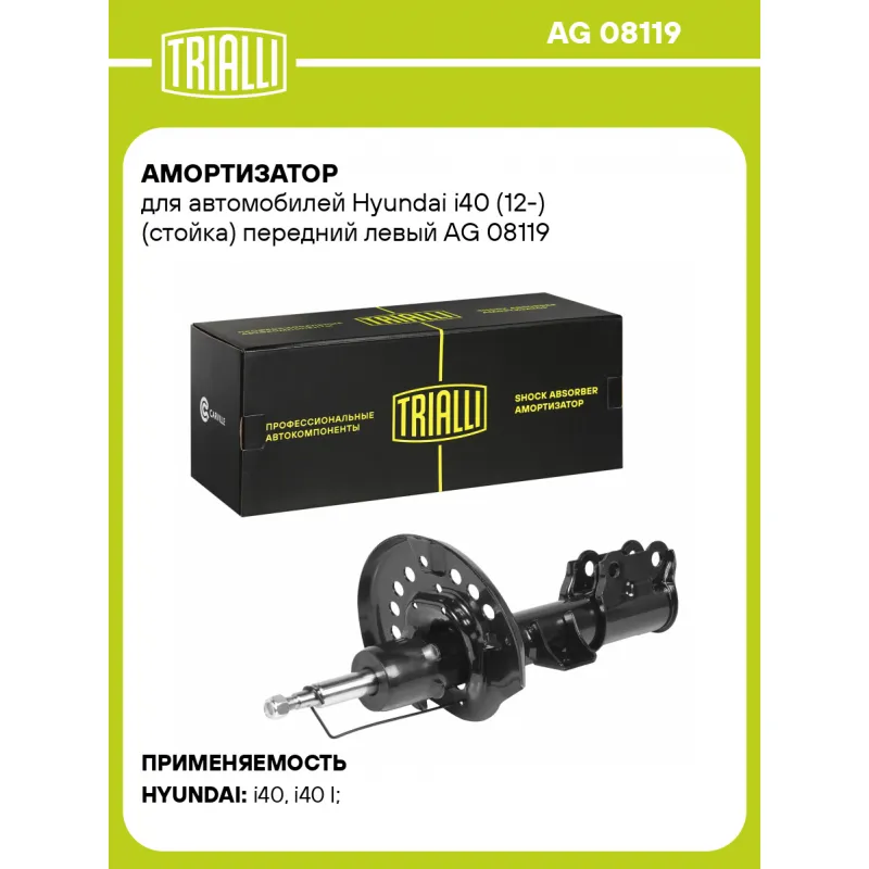 Амортизатор для автомобилей Hyundai i40 (12-) (стойка) передний левый Описание: Амортизатор AG 08119 бренда TRIALLI – это устройство для гашения колебаний (демпфирования) и поглощения толчков и ударов, действующих на раму. Особенности AG 08119: - Вид – Масляный с газовым подпором низкого давления; - Тип – Двухтрубный, гидравлический; Для крепления к деталям кузова или подвески используются крепления: верхнее Шток M12x1.25; и нижнее Скоба. Амортизатор в машину (стойка) имеет специальную площадку для установки пружины подвески. Совместим с: HYUNDAI i40.Подбор по VIN-номеру вашего автомобиля - через кнопку 'Задать вопрос'. Специалист проверит применяемость и ответит вам. Преимущества: - Инновационная технология производства; - Контроль качества каждой позиции по чертежам и с помощью 3D модели; - Сальник NOK; - Высокоэффективная система проектирования; - Гарантия до двух лет или 60 000 км пробега; Амортизаторы автомобильные существенно влияют на комфорт вождения, сокращая вибрации от неровностей дороги, что делает поездку более плавной и приятной. Регулярное и своевременное обслуживание амортизаторов помогут продлить их срок службы и обеспечить надёжную работу. Характеристики: Артикул: AG 08119 OEM номера: 54651-3ZAB0, 54651-3Z320, 54651-3Z800, 54651-3Z340, 54651-3Z010, 54651-3Z510, 54651-3Z900, 54651-3Z960, 54651-3Z920, 54651-3Z700, 54651-3Z330, 54651-3Z940, 54651-3Z110, 54651-3Z760, 54651-3Z020, 54651-3Z120, 54651-3Z130, 54651-3Z780, 54651-3Z720, 54651-3Z540, 54651-3Z140 Товарная линейка: BLACK Парный товар: AG 08320 Количество на автомобиль: 1 Вид амортизатора: Масляный с газовым подпором низкого давления Тип верхнего крепления: Шток Тип нижнего крепления: Скоба Диаметр корпуса, мм: 50 Диаметр штока, мм: 22 Ход штока, мм: 173 Размер резьбы штока: M12x1.25 Тип амортизатора: Двухтрубный, гидравлический Ось (сторона установки): Спереди, слева Дополнительная информация: Упаковка изделия может отличаться от представленной на фото Присоединительная длина 2, мм: 524 Присоединительная длина 1, мм: 351 Сопутствующий товар: Амортизаторы: AG 08320 Гарантийный срок: 2 года/60 000 км Комплектация: Гайка крепежная - 1 шт Амортизатор передний - 1 шт Гарантия: от 1 года.