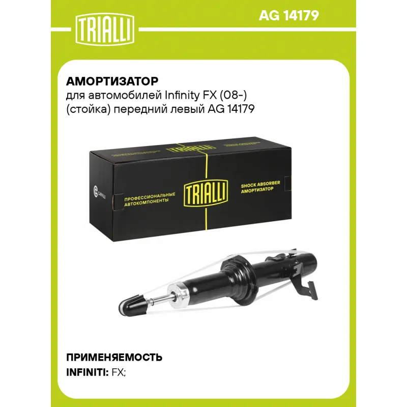 Амортизатор для автомобилей Infinity FX (08-) (стойка) передний левый Описание: Амортизатор AG 14179 бренда TRIALLI – это устройство для гашения колебаний (демпфирования) и поглощения толчков и ударов, действующих на раму. Особенности AG 14179: - Вид – Масляный с газовым подпором низкого давления; - Тип – Двухтрубный, гидравлический; Для крепления к деталям кузова или подвески используются крепления: верхнее Шток M12x1.25; и нижнее Кронштейн. Амортизатор в машину (стойка) имеет специальную площадку для установки пружины подвески. Совместим с: INFINITI FX.Подбор по VIN-номеру вашего автомобиля - через кнопку 'Задать вопрос'. Специалист проверит применяемость и ответит вам. Преимущества: - Инновационная технология производства; - Контроль качества каждой позиции по чертежам и с помощью 3D модели; - Сальник NOK; - Высокоэффективная система проектирования; - Гарантия до двух лет или 60 000 км пробега; Амортизаторы автомобильные существенно влияют на комфорт вождения, сокращая вибрации от неровностей дороги, что делает поездку более плавной и приятной. Регулярное и своевременное обслуживание амортизаторов помогут продлить их срок службы и обеспечить надёжную работу. Характеристики: Артикул: AG 14179 OEM номера: E61111CA0A, E61111CA0C, E61111CA0D, E61111CA0E, E61111CA1B, E61111CB0B, E61111CB0C, E61111CB1C, E61111CB1D, E61111CC0A, E61111CF0D, E61111CF0F, E61111DR0B, E61111DR0C, E61111DR1C, E61116WY0A, E61AA1CC0C, E6A111CA0E, E6A111CB0C, E6A111CB0D, E6A111CC0A, E6A111CF0F, E6A111DR0B, E61111CB0D Товарная линейка: BLACK Парный товар: AG 14380 Количество на автомобиль: 1 Вид амортизатора: Масляный с газовым подпором низкого давления Тип верхнего крепления: Шток Тип нижнего крепления: Кронштейн Диаметр корпуса, мм: 48 Диаметр штока, мм: 12.5 Ход штока, мм: 127 Размер резьбы штока: M12x1.25 Тип амортизатора: Двухтрубный, гидравлический Ось (сторона установки): Спереди, слева Дополнительная информация: Упаковка изделия может отличаться от представленной на фото Присоединительная длина 2, мм: 464 Присоединительная длина 1, мм: 337 Сопутствующий товар: Амортизаторы: AG 14380, AG 14516 Гарантийный срок: 2 года/60 000 км Комплектация: Амортизатор передний - 1 шт Гайка крепежная - 1 шт Гарантия: от 1 года.