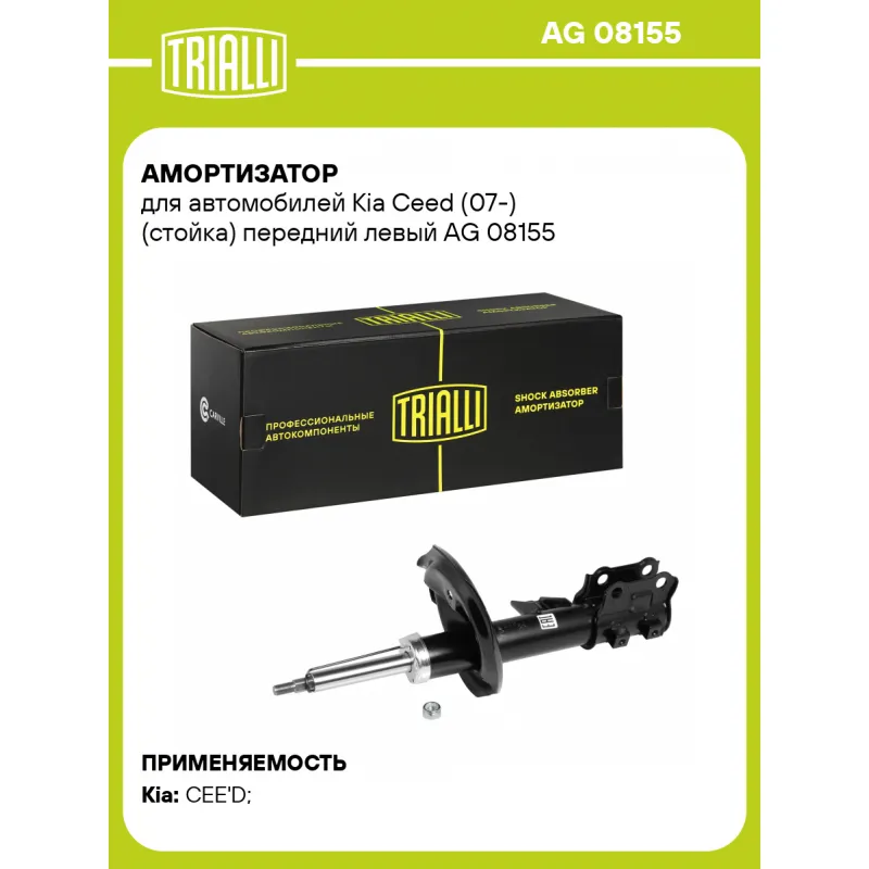 Амортизатор для автомобилей Kia Ceed (07-) (стойка) передний левый Описание: Амортизатор AG 08155 бренда TRIALLI – это устройство для гашения колебаний (демпфирования) и поглощения толчков и ударов, действующих на раму. Особенности AG 08155: - Вид – Масляный с газовым подпором низкого давления; - Тип – Двухтрубный, гидравлический; Для крепления к деталям кузова или подвески используются крепления: верхнее Шток M12x1.25; и нижнее Скоба. Амортизатор в машину (стойка) имеет специальную площадку для установки пружины подвески. Совместим с: KIA CEED.Подбор по VIN-номеру вашего автомобиля - через кнопку 'Задать вопрос'. Специалист проверит применяемость и ответит вам. Преимущества: - Инновационная технология производства; - Контроль качества каждой позиции по чертежам и с помощью 3D модели; - Сальник NOK; - Высокоэффективная система проектирования; - Гарантия до двух лет или 60 000 км пробега; Амортизаторы автомобильные существенно влияют на комфорт вождения, сокращая вибрации от неровностей дороги, что делает поездку более плавной и приятной. Регулярное и своевременное обслуживание амортизаторов помогут продлить их срок службы и обеспечить надёжную работу. Характеристики: Артикул: AG 08155 OEM номера: 54651-1H000, 54651-1H100, 54651-1H001, 54651-1H101 Товарная линейка: BLACK Парный товар: AG 08356 Количество на автомобиль: 1 Вид амортизатора: Масляный с газовым подпором низкого давления Тип верхнего крепления: Шток Тип нижнего крепления: Скоба Диаметр корпуса, мм: 48,5 Диаметр штока, мм: 22 Ход штока, мм: 159 Размер резьбы штока: M12x1.25 Тип амортизатора: Двухтрубный, гидравлический Ось (сторона установки): Спереди, слева Дополнительная информация: Для а/м до 01.10 г.в. Присоединительная длина 2, мм: 490 Сопутствующий товар: Опоры передних стоек: SA 0865, SA 0889 Присоединительная длина 1, мм: 331 Сопутствующий товар: Ремонтные комплекты амортизаторов: BC 1948, BCS 2048 Сопутствующий товар: Амортизаторы: AG 08356, AG 08306, AG 08504, AG 08105 Гарантийный срок: 2 года/60 000 км Подходит для авто: Kia CEE'D (07-) Для проверки применяемости отправьте VIN автомобиля через вкладку "Есть вопросы о товаре?" Комплектация: Амортизатор (стойка) передний - 1 шт Гайка крепежная - 1 шт Гарантия: от 1 года.