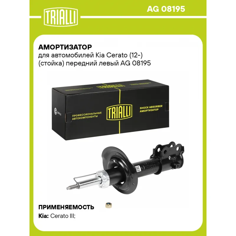 Амортизатор для автомобилей Kia Cerato (12-) (стойка) передний левый Описание: Амортизатор AG 08195 бренда TRIALLI – это устройство для гашения колебаний (демпфирования) и поглощения толчков и ударов, действующих на раму. Особенности AG 08195: - Вид – Масляный с газовым подпором низкого давления; - Тип – Двухтрубный, гидравлический; Для крепления к деталям кузова или подвески используются крепления: верхнее Шток M12x1.25; и нижнее Скоба. Амортизатор в машину (стойка) имеет специальную площадку для установки пружины подвески. Совместим с: KIA CERATO.Подбор по VIN-номеру вашего автомобиля - через кнопку 'Задать вопрос'. Специалист проверит применяемость и ответит вам. Преимущества: - Инновационная технология производства; - Контроль качества каждой позиции по чертежам и с помощью 3D модели; - Сальник NOK; - Высокоэффективная система проектирования; - Гарантия до двух лет или 60 000 км пробега; Амортизаторы автомобильные существенно влияют на комфорт вождения, сокращая вибрации от неровностей дороги, что делает поездку более плавной и приятной. Регулярное и своевременное обслуживание амортизаторов помогут продлить их срок службы и обеспечить надёжную работу. Характеристики: Артикул: AG 08195 OEM номера: 54651-A7100, 54651-A7200, 54651-A7210, 54651-A7300, 54651-A7400, 54651-A7600, 54651-A7650, 54651-A7220 Товарная линейка: BLACK Парный товар: AG 08396 Количество на автомобиль: 1 Вид амортизатора: Масляный с газовым подпором низкого давления Тип верхнего крепления: Шток Тип нижнего крепления: Скоба Диаметр корпуса, мм: 51 Диаметр штока, мм: 22 Ход штока, мм: 166 Размер резьбы штока: M12x1.25 Тип амортизатора: Двухтрубный, гидравлический Ось (сторона установки): Спереди, слева Присоединительная длина 2, мм: 497 Присоединительная длина 1, мм: 331 Сопутствующий товар: Ремонтные комплекты амортизаторов: BC 1948, BCS 2048 Сопутствующий товар: Амортизаторы: AG 08396, AG 08533 Гарантийный срок: 2 года/60 000 км Подходит для авто: Kia Cerato III (13-) Для проверки применяемости отправьте VIN автомобиля через вкладку "Есть вопросы о товаре?" Комплектация: Амортизатор (стойка) передний - 1 шт Гайка крепежная - 1 шт Гарантия: от 1 года.