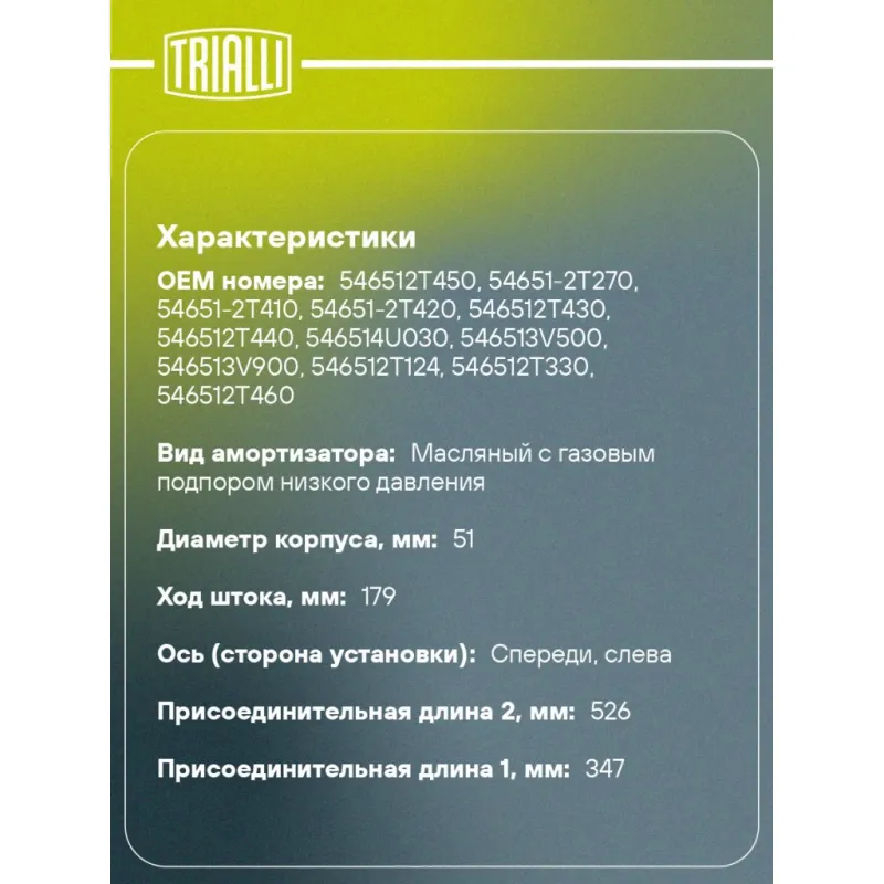 Амортизатор для автомобилей Kia Optima (10-) (стойка) передний левый от 05.2012 г.в. Описание: Амортизатор AG 08109 бренда TRIALLI – это устройство для гашения колебаний (демпфирования) и поглощения толчков и ударов, действующих на раму. Особенности AG 08109: - Вид – Масляный с газовым подпором низкого давления; - Тип – Двухтрубный, гидравлический; Для крепления к деталям кузова или подвески используются крепления: верхнее Шток M12x1.25; и нижнее Скоба. Амортизатор в машину (стойка) имеет специальную площадку для установки пружины подвески. Совместим с: HYUNDAI SONATA, KIA OPTIMA.Подбор по VIN-номеру вашего автомобиля - через кнопку 'Задать вопрос'. Специалист проверит применяемость и ответит вам. Преимущества: - Инновационная технология производства; - Контроль качества каждой позиции по чертежам и с помощью 3D модели; - Сальник NOK; - Высокоэффективная система проектирования; - Гарантия до двух лет или 60 000 км пробега; Амортизаторы автомобильные существенно влияют на комфорт вождения, сокращая вибрации от неровностей дороги, что делает поездку более плавной и приятной. Регулярное и своевременное обслуживание амортизаторов помогут продлить их срок службы и обеспечить надёжную работу. Характеристики: Артикул: AG 08109 OEM номера: 546512T450, 54651-2T270, 54651-2T410, 54651-2T420, 546512T430, 546512T440, 546514U030, 546513V500, 546513V900, 546512T124, 546512T330, 546512T460, 546512T480, 546512T824, 546513V281 Товарная линейка: BLACK Парный товар: AG 08310 Количество на автомобиль: 1 Вид амортизатора: Масляный с газовым подпором низкого давления Тип верхнего крепления: Шток Тип нижнего крепления: Скоба Диаметр корпуса, мм: 51 Диаметр штока, мм: 22 Ход штока, мм: 179 Размер резьбы штока: M12x1.25 Тип амортизатора: Двухтрубный, гидравлический Ось (сторона установки): Спереди, слева Присоединительная длина 2, мм: 526 Присоединительная длина 1, мм: 347 Сопутствующий товар: Ремонтные комплекты амортизаторов: BC 1966, BCS 2066 Сопутствующий товар: Амортизаторы: AG 08310, AG 08541 Гарантийный срок: 2 года/60 000 км Комплектация: Амортизатор (стойка) передний - 1 шт Гайка крепежная - 1 шт Гарантия: от 1 года.