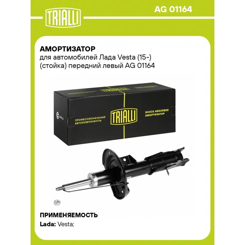 Амортизатор для автомобилей Лада Vesta (15-) (стойка) передний левый Описание: Амортизатор AG 01164 бренда TRIALLI – это устройство для гашения колебаний (демпфирования) и поглощения толчков и ударов, действующих на раму. Особенности AG 01164: - Вид – Масляный с газовым подпором низкого давления; - Тип – Двухтрубный, гидравлический; Для крепления к деталям кузова или подвески используются крепления: верхнее Шток M12x1.25; и нижнее Скоба. Амортизатор в машину (стойка) имеет специальную площадку для установки пружины подвески. Совместим с: HONDA VEZEL, LADA VESTA.Подбор по VIN-номеру вашего автомобиля - через кнопку 'Задать вопрос'. Специалист проверит применяемость и ответит вам. Преимущества: - Инновационная технология производства; - Контроль качества каждой позиции по чертежам и с помощью 3D модели; - Сальник NOK; - Высокоэффективная система проектирования; - Гарантия до двух лет или 60 000 км пробега; Амортизаторы автомобильные существенно влияют на комфорт вождения, сокращая вибрации от неровностей дороги, что делает поездку более плавной и приятной. Регулярное и своевременное обслуживание амортизаторов помогут продлить их срок службы и обеспечить надёжную работу. Характеристики: Артикул: AG 01164 OEM номера: 8450006745, 2180-2905403, 2180-2905403-00 Товарная линейка: BLACK Парный товар: AG 01365 Количество на автомобиль: 1 Вид амортизатора: Масляный с газовым подпором низкого давления Тип верхнего крепления: Шток Тип нижнего крепления: Скоба Диаметр корпуса, мм: 48,5 Диаметр штока, мм: 20 Ход штока, мм: 169 Размер резьбы штока: M12x1.25 Тип амортизатора: Двухтрубный, гидравлический Ось (сторона установки): Спереди, слева Дополнительная информация: Упаковка изделия может отличаться от представленной на фото Присоединительная длина 2, мм: 529 Сопутствующий товар: Опоры передних стоек: SA 0158, SA 0160 Присоединительная длина 1, мм: 360 Сопутствующий товар: Ремонтные комплекты амортизаторов: BC 0104, BC 0134, BCS 0104, BC 1848, BCS 1848,BC 0185, BC 0155, BCS 0155 Сопутствующий товар: Амортизаторы: AG 01365,AG 01519, AG 01515, AG 01373, AG 01172 Гарантийный срок: 2 года/60 000 км Подходит для авто: ВАЗ Vesta (15-) Для проверки применяемости отправьте VIN автомобиля через вкладку "Есть вопросы о товаре?" Комплектация: Амортизатор (стойка) передний - 1 шт Гайка крепежная - 1 шт Гарантия: от 1 года.