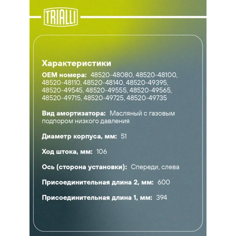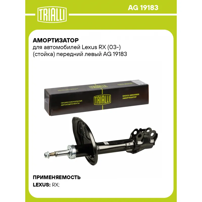 Амортизатор для автомобилей Lexus RX (03-) (стойка) передний левый Описание: Амортизатор AG 19183 бренда TRIALLI – это устройство для гашения колебаний (демпфирования) и поглощения толчков и ударов, действующих на раму. Особенности AG 19183: - Вид – Масляный с газовым подпором низкого давления; - Тип – Двухтрубный, гидравлический; Для крепления к деталям кузова или подвески используются крепления: верхнее Шток M14x1,5; и нижнее Скоба. Амортизатор в машину (стойка) имеет специальную площадку для установки пружины подвески. Совместим с: LEXUS RX.Подбор по VIN-номеру вашего автомобиля - через кнопку 'Задать вопрос'. Специалист проверит применяемость и ответит вам. Преимущества: - Инновационная технология производства; - Контроль качества каждой позиции по чертежам и с помощью 3D модели; - Сальник NOK; - Высокоэффективная система проектирования; - Гарантия до двух лет или 60 000 км пробега; Амортизаторы автомобильные существенно влияют на комфорт вождения, сокращая вибрации от неровностей дороги, что делает поездку более плавной и приятной. Регулярное и своевременное обслуживание амортизаторов помогут продлить их срок службы и обеспечить надёжную работу. Характеристики: Артикул: AG 19183 OEM номера: 48520-48080, 48520-48100, 48520-48110, 48520-48140, 48520-49395, 48520-49545, 48520-49555, 48520-49565, 48520-49715, 48520-49725, 48520-49735, 48520-49745, 48520-49875, 48520-49895, 48520-80015, 48520-80020, 48520-A9220 Товарная линейка: BLACK Парный товар: AG 19384 Количество на автомобиль: 1 Вид амортизатора: Масляный с газовым подпором низкого давления Тип верхнего крепления: Шток Тип нижнего крепления: Скоба Диаметр корпуса, мм: 51 Диаметр штока, мм: 22 Ход штока, мм: 106 Размер резьбы штока: M14x1,5 Тип амортизатора: Двухтрубный, гидравлический Ось (сторона установки): Спереди, слева Дополнительная информация: Упаковка изделия может отличаться от представленной на фото Присоединительная длина 2, мм: 600 Присоединительная длина 1, мм: 394 Сопутствующий товар: Амортизаторы: AG 19384, AG 19215, AG 19416 Гарантийный срок: 2 года/60 000 км Комплектация: Амортизатор (стойка) передний - 1 шт Гайка крепежная - 1 шт Гарантия: от 1 года.