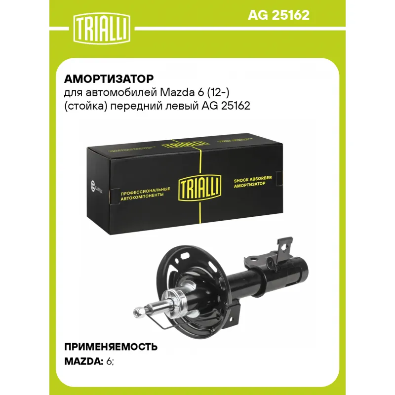 Амортизатор для автомобилей Mazda 6 (12-) (стойка) передний левый Описание: Амортизатор AG 25162 бренда TRIALLI – это устройство для гашения колебаний (демпфирования) и поглощения толчков и ударов, действующих на раму. Особенности AG 25162: - Вид – Масляный с газовым подпором низкого давления; - Тип – Двухтрубный, гидравлический; Для крепления к деталям кузова или подвески используются крепления: верхнее Шток M12x1,25; и нижнее Скоба. Амортизатор в машину (стойка) имеет специальную площадку для установки пружины подвески. Совместим с: MAZDA 6.Подбор по VIN-номеру вашего автомобиля - через кнопку 'Задать вопрос'. Специалист проверит применяемость и ответит вам. Преимущества: - Инновационная технология производства; - Контроль качества каждой позиции по чертежам и с помощью 3D модели; - Сальник NOK; - Высокоэффективная система проектирования; - Гарантия до двух лет или 60 000 км пробега; Амортизаторы автомобильные существенно влияют на комфорт вождения, сокращая вибрации от неровностей дороги, что делает поездку более плавной и приятной. Регулярное и своевременное обслуживание амортизаторов помогут продлить их срок службы и обеспечить надёжную работу. Характеристики: Артикул: AG 25162 OEM номера: GHP934900A, GHP934900B, GHT634900A, GJR934900, GJR934900C Товарная линейка: BLACK Парный товар: AG 25363 Количество на автомобиль: 1 Вид амортизатора: Масляный с газовым подпором низкого давления Тип верхнего крепления: Шток Тип нижнего крепления: Скоба Диаметр корпуса, мм: 50 Диаметр штока, мм: 22 Ход штока, мм: 201 Размер резьбы штока: M12x1,25 Тип амортизатора: Двухтрубный, гидравлический Ось (сторона установки): Сзади, слева Дополнительная информация: Упаковка изделия может отличаться от представленной на фото Присоединительная длина 2, мм: 539 Присоединительная длина 1, мм: 338 Сопутствующий товар: Амортизаторы: AG 25363 Гарантийный срок: 2 года/60 000 км Комплектация: Гайка крепежная - 1 шт Амортизатор передний - 1 шт Гарантия: от 1 года.