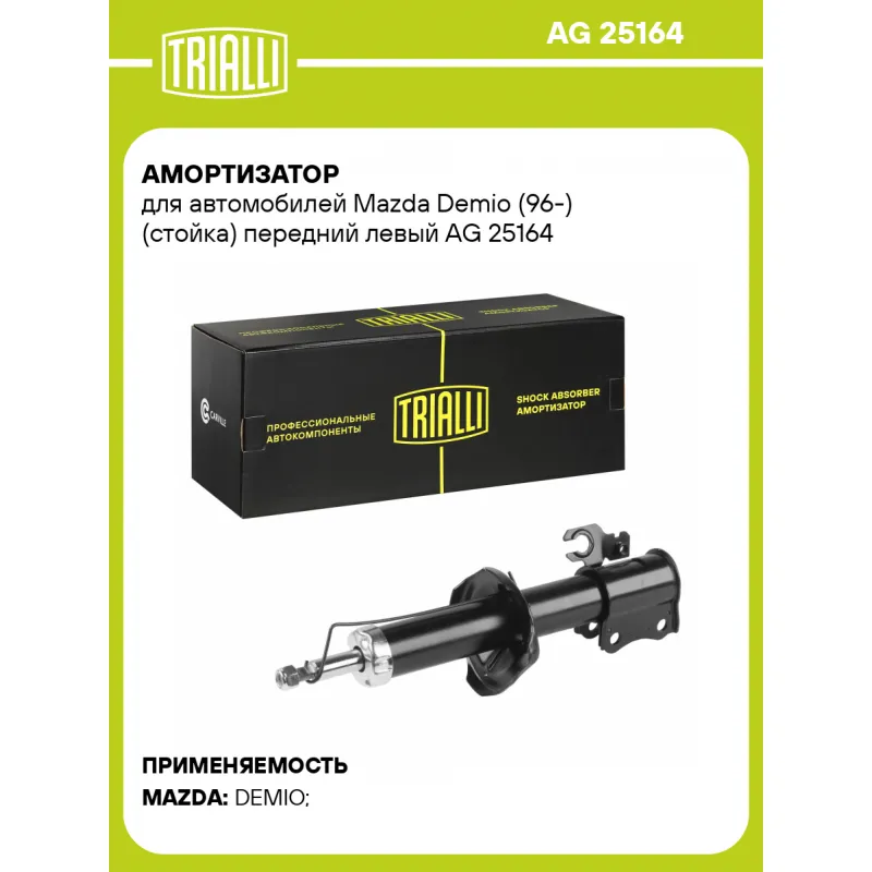 Амортизатор для автомобилей Mazda Demio (96-) (стойка) передний левый Описание: Амортизатор AG 25164 бренда TRIALLI – это устройство для гашения колебаний (демпфирования) и поглощения толчков и ударов, действующих на раму. Особенности AG 25164: - Вид – Масляный с газовым подпором низкого давления; - Тип – Двухтрубный, гидравлический; Для крепления к деталям кузова или подвески используются крепления: верхнее Шток M12x1.25; и нижнее Скоба. Амортизатор в машину (стойка) имеет специальную площадку для установки пружины подвески. Совместим с: MAZDA DEMIO.Подбор по VIN-номеру вашего автомобиля - через кнопку 'Задать вопрос'. Специалист проверит применяемость и ответит вам. Преимущества: - Инновационная технология производства; - Контроль качества каждой позиции по чертежам и с помощью 3D модели; - Сальник NOK; - Высокоэффективная система проектирования; - Гарантия до двух лет или 60 000 км пробега; Амортизаторы автомобильные существенно влияют на комфорт вождения, сокращая вибрации от неровностей дороги, что делает поездку более плавной и приятной. Регулярное и своевременное обслуживание амортизаторов помогут продлить их срок службы и обеспечить надёжную работу. Характеристики: Артикул: AG 25164 OEM номера: DC2034900, DC2037900, DC2234900, DC3534900, DC3734900 Товарная линейка: BLACK Парный товар: AG 25365 Количество на автомобиль: 1 Вид амортизатора: Масляный с газовым подпором низкого давления Тип верхнего крепления: Шток Тип нижнего крепления: Скоба Диаметр корпуса, мм: 45 Диаметр штока, мм: 18 Ход штока, мм: 150 Размер резьбы штока: M12x1.25 Тип амортизатора: Двухтрубный, гидравлический Ось (сторона установки): Спереди, слева Дополнительная информация: Упаковка изделия может отличаться от представленной на фото Присоединительная длина 2, мм: 472 Присоединительная длина 1, мм: 322 Сопутствующий товар: Амортизаторы: AG 25365, AG 25510 Гарантийный срок: 2 года/60 000 км Комплектация: Амортизатор (стойка) передний - 1 шт Гайка крепежная - 1 шт Гарантия: от 1 года.