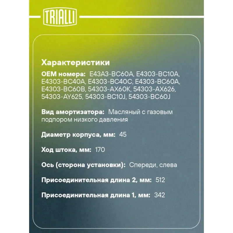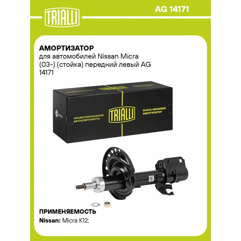 Амортизатор для автомобилей Nissan Micra (03-) (стойка) передний левый Описание: Амортизатор AG 14171 бренда TRIALLI – это устройство для гашения колебаний (демпфирования) и поглощения толчков и ударов, действующих на раму. Особенности AG 14171: - Вид – Масляный с газовым подпором низкого давления; - Тип – Двухтрубный, гидравлический; Для крепления к деталям кузова или подвески используются крепления: верхнее Шток M12x1.25; и нижнее Скоба. Амортизатор в машину (стойка) имеет специальную площадку для установки пружины подвески. Совместим с: NISSAN MICRA.Подбор по VIN-номеру вашего автомобиля - через кнопку 'Задать вопрос'. Специалист проверит применяемость и ответит вам. Преимущества: - Инновационная технология производства; - Контроль качества каждой позиции по чертежам и с помощью 3D модели; - Сальник NOK; - Высокоэффективная система проектирования; - Гарантия до двух лет или 60 000 км пробега; Амортизаторы автомобильные существенно влияют на комфорт вождения, сокращая вибрации от неровностей дороги, что делает поездку более плавной и приятной. Регулярное и своевременное обслуживание амортизаторов помогут продлить их срок службы и обеспечить надёжную работу. Характеристики: Артикул: AG 14171 OEM номера: E43A3-BC60A, E4303-BC10A, E4303-BC40A, E4303-BC40C, E4303-BC60A, E4303-BC60B, 54303-AX60K, 54303-AX626, 54303-AY625, 54303-BC10J, 54303-BC60J, 54303-AX612 Товарная линейка: BLACK Парный товар: AG 14372 Количество на автомобиль: 1 Вид амортизатора: Масляный с газовым подпором низкого давления Тип верхнего крепления: Шток Тип нижнего крепления: Скоба Диаметр корпуса, мм: 45 Диаметр штока, мм: 20 Ход штока, мм: 170 Размер резьбы штока: M12x1.25 Тип амортизатора: Двухтрубный, гидравлический Ось (сторона установки): Спереди, слева Дополнительная информация: Упаковка изделия может отличаться от представленной на фото Присоединительная длина 2, мм: 512 Присоединительная длина 1, мм: 342 Сопутствующий товар: Ремонтные комплекты амортизаторов: BC 1848, BC 1866, BCS 1848, BCS 1866 Сопутствующий товар: Амортизаторы: AG 14372, AG 14513 Гарантийный срок: 2 года/60 000 км Подходит для авто: Nissan Micra K12 (02-), Micra K12 (02-) Для проверки применяемости отправьте VIN автомобиля через вкладку "Есть вопросы о товаре?" Комплектация: Амортизатор (стойка) передний - 1 шт Гайка крепежная - 1 шт Гарантия: от 1 года.