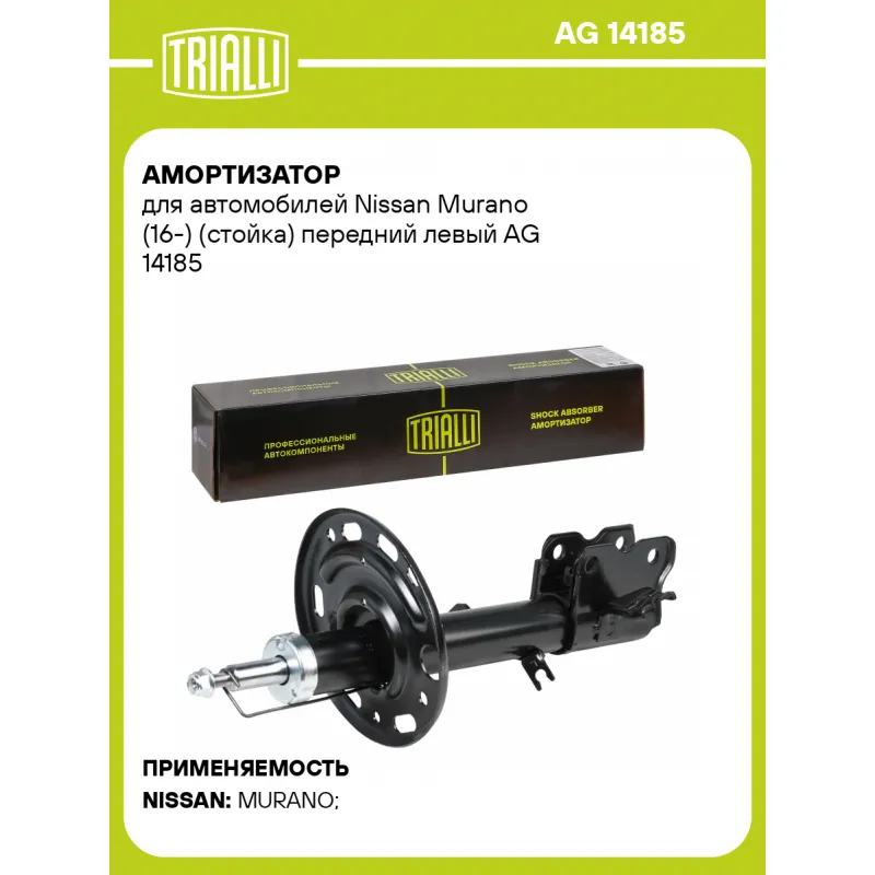 Амортизатор для автомобилей Nissan Murano (16-) (стойка) передний левый Описание: Амортизатор AG 14185 бренда TRIALLI – это устройство для гашения колебаний (демпфирования) и поглощения толчков и ударов, действующих на раму. Особенности AG 14185: - Вид – Масляный с газовым подпором низкого давления; - Тип – Двухтрубный, гидравлический; Для крепления к деталям кузова или подвески используются крепления: верхнее Шток M12x1,25; и нижнее Скоба. Амортизатор в машину (стойка) имеет специальную площадку для установки пружины подвески. Совместим с: NISSAN MURANO.Подбор по VIN-номеру вашего автомобиля - через кнопку 'Задать вопрос'. Специалист проверит применяемость и ответит вам. Преимущества: - Инновационная технология производства; - Контроль качества каждой позиции по чертежам и с помощью 3D модели; - Сальник NOK; - Высокоэффективная система проектирования; - Гарантия до двух лет или 60 000 км пробега; Амортизаторы автомобильные существенно влияют на комфорт вождения, сокращая вибрации от неровностей дороги, что делает поездку более плавной и приятной. Регулярное и своевременное обслуживание амортизаторов помогут продлить их срок службы и обеспечить надёжную работу. Характеристики: Артикул: AG 14185 OEM номера: E43035BF0B, E43035BK0B Товарная линейка: BLACK Парный товар: AG 14386 Количество на автомобиль: 1 Вид амортизатора: Масляный с газовым подпором низкого давления Тип верхнего крепления: Шток Тип нижнего крепления: Скоба Диаметр корпуса, мм: 51 Диаметр штока, мм: 22 Ход штока, мм: 191 Размер резьбы штока: M12x1,25 Тип амортизатора: Двухтрубный, гидравлический Ось (сторона установки): Спереди, слева Дополнительная информация: Упаковка изделия может отличаться от представленной на фото Присоединительная длина 2, мм: 594 Присоединительная длина 1, мм: 403 Сопутствующий товар: Амортизаторы: AG 14386 Гарантийный срок: 2 года/60 000 км Комплектация: Гайка крепежная - 1 шт Амортизатор передний - 1 шт Гарантия: от 1 года.