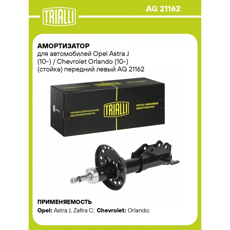 Амортизатор для автомобилей Opel Astra J (10-) / Chevrolet Orlando (10-) (стойка) передний левый Описание: Амортизатор AG 21162 бренда TRIALLI – это устройство для гашения колебаний (демпфирования) и поглощения толчков и ударов, действующих на раму. Особенности AG 21162: - Вид – Масляный с газовым подпором низкого давления; - Тип – Двухтрубный, гидравлический; Для крепления к деталям кузова или подвески используются крепления: верхнее Шток M14x1,5; и нижнее Скоба. Амортизатор в машину (стойка) имеет специальную площадку для установки пружины подвески. Совместим с: CHEVROLET ORLANDO, OPEL ZAFIRA, ASTRA.Подбор по VIN-номеру вашего автомобиля - через кнопку 'Задать вопрос'. Специалист проверит применяемость и ответит вам. Преимущества: - Инновационная технология производства; - Контроль качества каждой позиции по чертежам и с помощью 3D модели; - Сальник NOK; - Высокоэффективная система проектирования; - Гарантия до двух лет или 60 000 км пробега; Амортизаторы автомобильные существенно влияют на комфорт вождения, сокращая вибрации от неровностей дороги, что делает поездку более плавной и приятной. Регулярное и своевременное обслуживание амортизаторов помогут продлить их срок службы и обеспечить надёжную работу. Характеристики: Артикул: AG 21162 OEM номера: 13261196, 13347296, 13347298, 13310091, 13310093, 13310099, 13310101, 13354011, 13354013, 13354015, 13354035, 13354037, 13368505, 13412591, 13412595, 13354009, 0344477, 0344483, 0344485, 0344593, 0344620, 0344622, 0344624, 0344629, 0344753, 0344755, 0344768, 0344935, 0344991, 13412597, 13474003, 0344937, 0345128 Товарная линейка: BLACK Парный товар: AG 21363 Количество на автомобиль: 1 Вид амортизатора: Масляный с газовым подпором низкого давления Тип верхнего крепления: Шток Тип нижнего крепления: Скоба Диаметр корпуса, мм: 54 Диаметр штока, мм: 22 Ход штока, мм: 141 Размер резьбы штока: M14x1,5 Тип амортизатора: Двухтрубный, гидравлический Ось (сторона установки): Спереди, слева Дополнительная информация: Для а/м со спортивной подвеской; Для а/м до 07.2012 г.в. Присоединительная длина 2, мм: 513 Присоединительная длина 1, мм: 372 Сопутствующий товар: Амортизаторы: AG 21363 Гарантийный срок: 2 года/60 000 км Подходит для авто: Opel Astra J (10-), Zafira C (11-), Astra J (10-) Chevrolet Orlando (10-) Для проверки применяемости отправьте VIN автомобиля через вкладку "Есть вопросы о товаре?" Комплектация: Гайка крепежная - 1 шт Амортизатор (стойка) передний - 1 шт Гарантия: от 1 года.