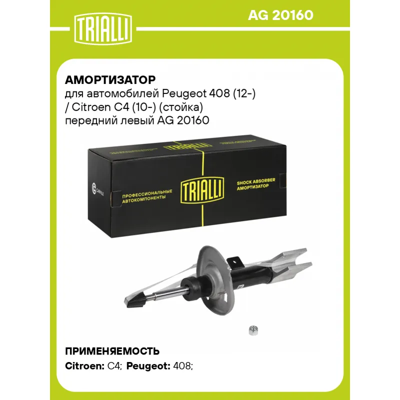 Амортизатор для автомобилей Peugeot 408 (12-) / Citroen C4 (10-) (стойка) передний левый Описание: Амортизатор AG 20160 бренда TRIALLI – это устройство для гашения колебаний (демпфирования) и поглощения толчков и ударов, действующих на раму. Особенности AG 20160: - Вид – Масляный с газовым подпором низкого давления; - Тип – Двухтрубный, гидравлический; Для крепления к деталям кузова или подвески используются крепления: верхнее Шток M14x1,5; и нижнее Скоба. Амортизатор в машину (стойка) имеет специальную площадку для установки пружины подвески. Совместим с: CITROEN C4, PEUGEOT 408.Подбор по VIN-номеру вашего автомобиля - через кнопку 'Задать вопрос'. Специалист проверит применяемость и ответит вам. Преимущества: - Инновационная технология производства; - Контроль качества каждой позиции по чертежам и с помощью 3D модели; - Сальник NOK; - Высокоэффективная система проектирования; - Гарантия до двух лет или 60 000 км пробега; Амортизаторы автомобильные существенно влияют на комфорт вождения, сокращая вибрации от неровностей дороги, что делает поездку более плавной и приятной. Регулярное и своевременное обслуживание амортизаторов помогут продлить их срок службы и обеспечить надёжную работу. Характеристики: Артикул: AG 20160 OEM номера: 9803768480, 9803768680, 9806941280, 98 071 769 80, 9807383580, 9822724980, 9822725280 Товарная линейка: BLACK Парный товар: AG 20361 Количество на автомобиль: 1 Вид амортизатора: Масляный с газовым подпором низкого давления Тип верхнего крепления: Шток Тип нижнего крепления: Скоба Диаметр корпуса, мм: 51 Диаметр штока, мм: 20 Ход штока, мм: 178 Размер резьбы штока: M14x1,5 Тип амортизатора: Двухтрубный, гидравлический Ось (сторона установки): Спереди, слева Присоединительная длина 2, мм: 512 Присоединительная длина 1, мм: 334 Сопутствующий товар: Ремонтные комплекты амортизаторов: BC 1866, BCS 1866 Сопутствующий товар: Амортизаторы: AG 20361,AG 20507 Гарантийный срок: 2 года/60 000 км Подходит для авто: Citroen C4 (10-) Peugeot 408 (10-) Для проверки применяемости отправьте VIN автомобиля через вкладку "Есть вопросы о товаре?" Комплектация: Амортизатор (стойка) передний - 1 шт Гайка крепежная - 1 шт Гарантия: от 1 года.