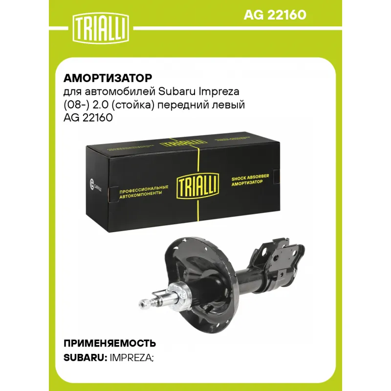 Амортизатор для автомобилей Subaru Impreza (08-) 2.0 (стойка) передний левый Описание: Амортизатор AG 22160 бренда TRIALLI – это устройство для гашения колебаний (демпфирования) и поглощения толчков и ударов, действующих на раму. Особенности AG 22160: - Вид – Масляный с газовым подпором низкого давления; - Тип – Двухтрубный, гидравлический; Для крепления к деталям кузова или подвески используются крепления: верхнее Шток M12x1.25; и нижнее Скоба. Амортизатор в машину (стойка) имеет специальную площадку для установки пружины подвески. Совместим с: SUBARU IMPREZA.Подбор по VIN-номеру вашего автомобиля - через кнопку 'Задать вопрос'. Специалист проверит применяемость и ответит вам. Преимущества: - Инновационная технология производства; - Контроль качества каждой позиции по чертежам и с помощью 3D модели; - Сальник NOK; - Высокоэффективная система проектирования; - Гарантия до двух лет или 60 000 км пробега; Амортизаторы автомобильные существенно влияют на комфорт вождения, сокращая вибрации от неровностей дороги, что делает поездку более плавной и приятной. Регулярное и своевременное обслуживание амортизаторов помогут продлить их срок службы и обеспечить надёжную работу. Характеристики: Артикул: AG 22160 OEM номера: 20310FG050, 20310FG150, 20310FG0509L Товарная линейка: BLACK Парный товар: AG 22361 Количество на автомобиль: 1 Вид амортизатора: Масляный с газовым подпором низкого давления Тип верхнего крепления: Шток Тип нижнего крепления: Скоба Диаметр корпуса, мм: 50 Диаметр штока, мм: 22 Ход штока, мм: 170 Размер резьбы штока: M12x1.25 Тип амортизатора: Двухтрубный, гидравлический Ось (сторона установки): Спереди, слева Дополнительная информация: Упаковка изделия может отличаться от представленной на фото Присоединительная длина 2, мм: 502±3 Присоединительная длина 1, мм: 332±3 Сопутствующий товар: Амортизаторы: AG 22361 Гарантийный срок: 2 года/60 000 км Комплектация: Амортизатор (стойка) передний - 1 шт Гайка крепежная - 1 шт Гарантия: от 1 года.