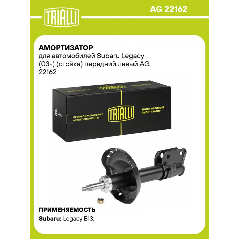 Амортизатор для автомобилей Subaru Legacy (03-) (стойка) передний левый Описание: Амортизатор AG 22162 бренда TRIALLI – это устройство для гашения колебаний (демпфирования) и поглощения толчков и ударов, действующих на раму. Особенности AG 22162: - Вид – Масляный с газовым подпором низкого давления; - Тип – Двухтрубный, гидравлический; Для крепления к деталям кузова или подвески используются крепления: верхнее Шток M14x1.5; и нижнее Скоба. Амортизатор в машину (стойка) имеет специальную площадку для установки пружины подвески. Совместим с: SUBARU LEGACY.Подбор по VIN-номеру вашего автомобиля - через кнопку 'Задать вопрос'. Специалист проверит применяемость и ответит вам. Преимущества: - Инновационная технология производства; - Контроль качества каждой позиции по чертежам и с помощью 3D модели; - Сальник NOK; - Высокоэффективная система проектирования; - Гарантия до двух лет или 60 000 км пробега; Амортизаторы автомобильные существенно влияют на комфорт вождения, сокращая вибрации от неровностей дороги, что делает поездку более плавной и приятной. Регулярное и своевременное обслуживание амортизаторов помогут продлить их срок службы и обеспечить надёжную работу. Характеристики: Артикул: AG 22162 OEM номера: 20310AG010, 20310AG011, 20310AG030, 20310AG090, 20310AG4509L, 20310-AG090-9L, 20310-AG030-9L Товарная линейка: BLACK Парный товар: AG 22363 Количество на автомобиль: 1 Вид амортизатора: Масляный с газовым подпором низкого давления Тип верхнего крепления: Шток Тип нижнего крепления: Скоба Диаметр корпуса, мм: 51 Диаметр штока, мм: 22 Ход штока, мм: 160 Размер резьбы штока: M14x1.5 Тип амортизатора: Двухтрубный, гидравлический Ось (сторона установки): Спереди, слева Присоединительная длина 2, мм: 505 Присоединительная длина 1, мм: 345 Сопутствующий товар: Ремонтные комплекты амортизаторов: BC 1948, BCS 2048 Сопутствующий товар: Амортизаторы: AG 22363 Гарантийный срок: 2 года/60 000 км Подходит для авто: Subaru Legacy B13 (03-) Для проверки применяемости отправьте VIN автомобиля через вкладку "Есть вопросы о товаре?" Комплектация: Гайка крепежная - 1 шт Амортизатор передний - 1 шт Гарантия: от 1 года.