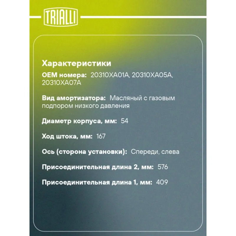 Амортизатор для автомобилей Subaru Tribeca (05-) (стойка) передний левый Описание: Амортизатор AG 22166 бренда TRIALLI – это устройство для гашения колебаний (демпфирования) и поглощения толчков и ударов, действующих на раму. Особенности AG 22166: - Вид – Масляный с газовым подпором низкого давления; - Тип – Двухтрубный, гидравлический; Для крепления к деталям кузова или подвески используются крепления: верхнее Шток M14x1,5; и нижнее Скоба. Амортизатор в машину (стойка) имеет специальную площадку для установки пружины подвески. Совместим с: SUBARU TRIBECA.Подбор по VIN-номеру вашего автомобиля - через кнопку 'Задать вопрос'. Специалист проверит применяемость и ответит вам. Преимущества: - Инновационная технология производства; - Контроль качества каждой позиции по чертежам и с помощью 3D модели; - Сальник NOK; - Высокоэффективная система проектирования; - Гарантия до двух лет или 60 000 км пробега; Амортизаторы автомобильные существенно влияют на комфорт вождения, сокращая вибрации от неровностей дороги, что делает поездку более плавной и приятной. Регулярное и своевременное обслуживание амортизаторов помогут продлить их срок службы и обеспечить надёжную работу. Характеристики: Артикул: AG 22166 OEM номера: 20310XA01A, 20310XA05A, 20310XA07A Товарная линейка: BLACK Парный товар: AG 22367 Количество на автомобиль: 1 Вид амортизатора: Масляный с газовым подпором низкого давления Тип верхнего крепления: Шток Тип нижнего крепления: Скоба Диаметр корпуса, мм: 54 Диаметр штока, мм: 25 Ход штока, мм: 167 Размер резьбы штока: M14x1,5 Тип амортизатора: Двухтрубный, гидравлический Ось (сторона установки): Спереди, слева Дополнительная информация: Упаковка изделия может отличаться от представленной на фото Присоединительная длина 2, мм: 576 Присоединительная длина 1, мм: 409 Сопутствующий товар: Амортизаторы: AG 22367, AG 22509 Гарантийный срок: 2 года/60 000 км Комплектация: Гайка крепежная - 1 шт Амортизатор (стойка) передний - 1 шт Гарантия: от 1 года.