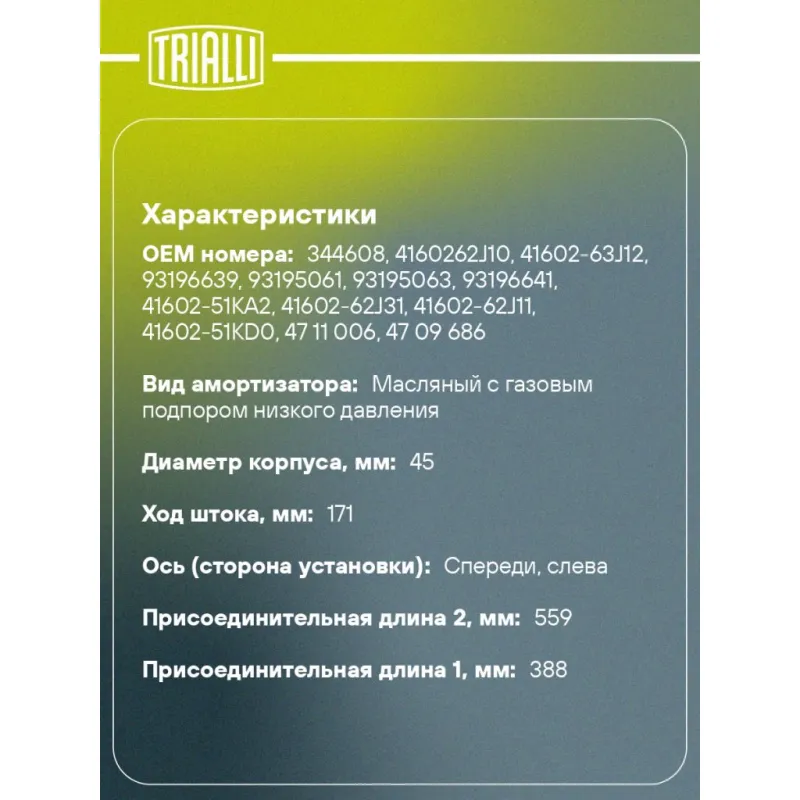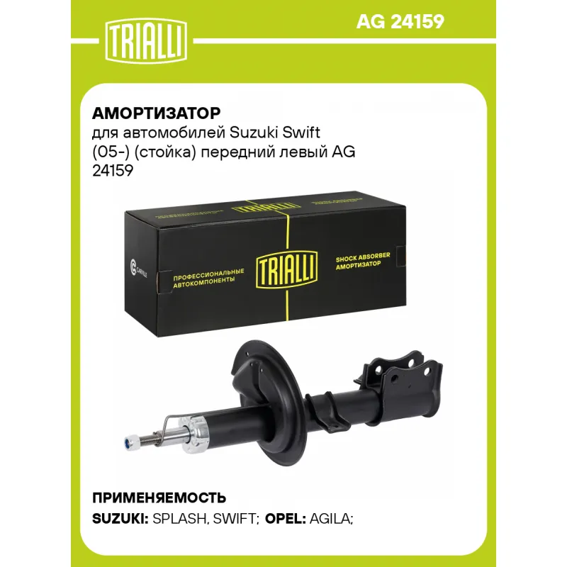 Амортизатор для автомобилей Suzuki Swift (05-) (стойка) передний левый Описание: Амортизатор AG 24159 бренда TRIALLI – это устройство для гашения колебаний (демпфирования) и поглощения толчков и ударов, действующих на раму. Особенности AG 24159: - Вид – Масляный с газовым подпором низкого давления; - Тип – Двухтрубный, гидравлический; Для крепления к деталям кузова или подвески используются крепления: верхнее Шток M12x1.25; и нижнее Скоба. Амортизатор в машину (стойка) имеет специальную площадку для установки пружины подвески. Совместим с: OPEL AGILA, SUZUKI SPLASH, SWIFT.Подбор по VIN-номеру вашего автомобиля - через кнопку 'Задать вопрос'. Специалист проверит применяемость и ответит вам. Преимущества: - Инновационная технология производства; - Контроль качества каждой позиции по чертежам и с помощью 3D модели; - Сальник NOK; - Высокоэффективная система проектирования; - Гарантия до двух лет или 60 000 км пробега; Амортизаторы автомобильные существенно влияют на комфорт вождения, сокращая вибрации от неровностей дороги, что делает поездку более плавной и приятной. Регулярное и своевременное обслуживание амортизаторов помогут продлить их срок службы и обеспечить надёжную работу. Характеристики: Артикул: AG 24159 OEM номера: 344608, 4160262J10, 41602-63J12, 93196639, 93195061, 93195063, 93196641, 41602-51KA2, 41602-62J31, 41602-62J11, 41602-51KD0, 47 11 006, 47 09 686, 47 09 684, 47 11 008 Товарная линейка: BLACK Парный товар: AG 24360 Количество на автомобиль: 1 Вид амортизатора: Масляный с газовым подпором низкого давления Тип верхнего крепления: Шток Тип нижнего крепления: Скоба Диаметр корпуса, мм: 45 Диаметр штока, мм: 20 Ход штока, мм: 171 Размер резьбы штока: M12x1.25 Тип амортизатора: Двухтрубный, гидравлический Ось (сторона установки): Спереди, слева Присоединительная длина 2, мм: 559 Присоединительная длина 1, мм: 388 Сопутствующий товар: Ремонтные комплекты амортизаторов: BC 1848, BC 1866, BCS 1848, BCS 1866 Сопутствующий товар: Амортизаторы: AG 24360,AG 24506 Гарантийный срок: 2 года/60 000 км Комплектация: Амортизатор передний - 1 шт Гайка крепежная - 1 шт Гарантия: от 1 года.