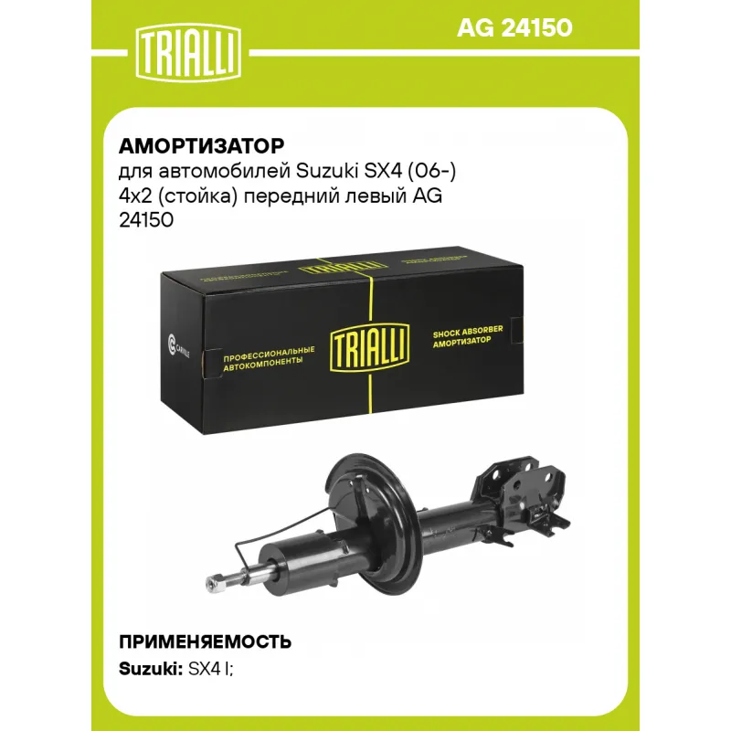 Амортизатор для автомобилей Suzuki SX4 (06-) 4x2 (стойка) передний левый Описание: Амортизатор AG 24150 бренда TRIALLI – это устройство для гашения колебаний (демпфирования) и поглощения толчков и ударов, действующих на раму. Особенности AG 24150: - Вид – Масляный с газовым подпором низкого давления; - Тип – Двухтрубный, гидравлический; Для крепления к деталям кузова или подвески используются крепления: верхнее Шток M12x1.25; и нижнее Скоба. Амортизатор в машину (стойка) имеет специальную площадку для установки пружины подвески. Совместим с: SUZUKI SX4.Подбор по VIN-номеру вашего автомобиля - через кнопку 'Задать вопрос'. Специалист проверит применяемость и ответит вам. Преимущества: - Инновационная технология производства; - Контроль качества каждой позиции по чертежам и с помощью 3D модели; - Сальник NOK; - Высокоэффективная система проектирования; - Гарантия до двух лет или 60 000 км пробега; Амортизаторы автомобильные существенно влияют на комфорт вождения, сокращая вибрации от неровностей дороги, что делает поездку более плавной и приятной. Регулярное и своевременное обслуживание амортизаторов помогут продлить их срок службы и обеспечить надёжную работу. Характеристики: Артикул: AG 24150 OEM номера: 71747048, 71747478, 71747564, 71750446, 41602-79J01, 41602-79J51, 41602-79J01-000 Товарная линейка: BLACK Парный товар: AG 24351 Количество на автомобиль: 1 Вид амортизатора: Масляный с газовым подпором низкого давления Тип верхнего крепления: Шток Тип нижнего крепления: Скоба Диаметр корпуса, мм: 50 Диаметр штока, мм: 20 Ход штока, мм: 185 Размер резьбы штока: M12x1.25 Тип амортизатора: Двухтрубный, гидравлический Ось (сторона установки): Спереди, слева Дополнительная информация: Для всех комплектаций кроме с 17-ти дюймовыми дисками с завода Присоединительная длина 2, мм: 571±3 Присоединительная длина 1, мм: 386±3 Сопутствующий товар: Амортизаторы: AG 24351, AG 24501 Гарантийный срок: 2 года/60 000 км Подходит для авто: Suzuki SX4 I (06-), SX4 I (06-) Для проверки применяемости отправьте VIN автомобиля через вкладку "Есть вопросы о товаре?" Комплектация: Амортизатор (стойка) передний - 1 шт Гайка крепежная - 1 шт Гарантия: от 1 года.