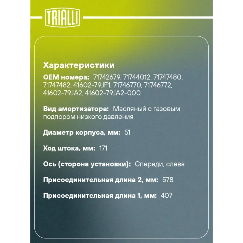 Амортизатор для автомобилей Suzuki SX4 (06-) 4x4 (стойка) передний левый Описание: Амортизатор AG 24152 бренда TRIALLI – это устройство для гашения колебаний (демпфирования) и поглощения толчков и ударов, действующих на раму. Особенности AG 24152: - Вид – Масляный с газовым подпором низкого давления; - Тип – Двухтрубный, гидравлический; Для крепления к деталям кузова или подвески используются крепления: верхнее Шток M12x1.25; и нижнее Скоба. Амортизатор в машину (стойка) имеет специальную площадку для установки пружины подвески. Совместим с: FIAT SEDICI, SUZUKI SX4.Подбор по VIN-номеру вашего автомобиля - через кнопку 'Задать вопрос'. Специалист проверит применяемость и ответит вам. Преимущества: - Инновационная технология производства; - Контроль качества каждой позиции по чертежам и с помощью 3D модели; - Сальник NOK; - Высокоэффективная система проектирования; - Гарантия до двух лет или 60 000 км пробега; Амортизаторы автомобильные существенно влияют на комфорт вождения, сокращая вибрации от неровностей дороги, что делает поездку более плавной и приятной. Регулярное и своевременное обслуживание амортизаторов помогут продлить их срок службы и обеспечить надёжную работу. Характеристики: Артикул: AG 24152 OEM номера: 71742679, 71744012, 71747480, 71747482, 41602-79JF1, 71746770, 71746772, 41602-79JA2, 41602-79JA2-000 Товарная линейка: BLACK Парный товар: AG 24353 Количество на автомобиль: 1 Вид амортизатора: Масляный с газовым подпором низкого давления Тип верхнего крепления: Шток Тип нижнего крепления: Скоба Диаметр корпуса, мм: 51 Диаметр штока, мм: 20 Ход штока, мм: 171 Размер резьбы штока: M12x1.25 Тип амортизатора: Двухтрубный, гидравлический Ось (сторона установки): Спереди, слева Дополнительная информация: Для всех комплектаций кроме с 17-ти дюймовыми дисками с завода Присоединительная длина 2, мм: 578 Присоединительная длина 1, мм: 407 Сопутствующий товар: Ремонтные комплекты амортизаторов: BC 1848, BC 1866, BCS 1848, BCS 1866 Сопутствующий товар: Амортизаторы: AG 24353,AG 24502 Гарантийный срок: 2 года/60 000 км Подходит для авто: Suzuki SX4 I (06-), SX4 I (06-) Для проверки применяемости отправьте VIN автомобиля через вкладку "Есть вопросы о товаре?" Комплектация: Амортизатор передний - 1 шт Гайка крепежная - 1 шт Гарантия: от 1 года.