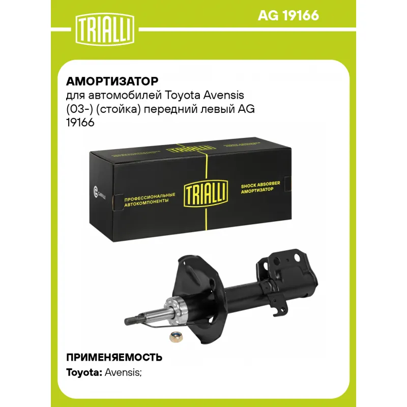 Амортизатор для автомобилей Toyota Avensis (03-) (стойка) передний левый Описание: Амортизатор AG 19166 бренда TRIALLI – это устройство для гашения колебаний (демпфирования) и поглощения толчков и ударов, действующих на раму. Особенности AG 19166: - Вид – Масляный с газовым подпором низкого давления; - Тип – Двухтрубный, гидравлический; Для крепления к деталям кузова или подвески используются крепления: верхнее Шток M14x1.5; и нижнее Скоба. Амортизатор в машину (стойка) имеет специальную площадку для установки пружины подвески. Совместим с: TOYOTA AVENSIS.Подбор по VIN-номеру вашего автомобиля - через кнопку 'Задать вопрос'. Специалист проверит применяемость и ответит вам. Преимущества: - Инновационная технология производства; - Контроль качества каждой позиции по чертежам и с помощью 3D модели; - Сальник NOK; - Высокоэффективная система проектирования; - Гарантия до двух лет или 60 000 км пробега; Амортизаторы автомобильные существенно влияют на комфорт вождения, сокращая вибрации от неровностей дороги, что делает поездку более плавной и приятной. Регулярное и своевременное обслуживание амортизаторов помогут продлить их срок службы и обеспечить надёжную работу. Характеристики: Артикул: AG 19166 OEM номера: 4852005200, 4852005210, 4852005220, 4852005230, 4852009650, 4852009660, 4852009670, 4852009680, 4852009860, 4852009A50, 4852009G20, 4852009870, 4852009A70, 4852069660 Товарная линейка: BLACK Парный товар: AG 19367 Количество на автомобиль: 1 Вид амортизатора: Масляный с газовым подпором низкого давления Тип верхнего крепления: Шток Тип нижнего крепления: Скоба Диаметр корпуса, мм: 51 Диаметр штока, мм: 22 Ход штока, мм: 125 Размер резьбы штока: M14x1.5 Тип амортизатора: Двухтрубный, гидравлический Ось (сторона установки): Спереди, слева Дополнительная информация: Упаковка изделия может отличаться от представленной на фото Присоединительная длина 2, мм: 464 Сопутствующий товар: Опоры передних стоек: SA 1957 Присоединительная длина 1, мм: 339 Сопутствующий товар: Ремонтные комплекты амортизаторов: BC 1948, BCS 2048 Сопутствующий товар: Амортизаторы: AG 19367,AG 19512 Гарантийный срок: 2 года/60 000 км Подходит для авто: Toyota Avensis (03-), Avensis (03-), Avensis (03-) Для проверки применяемости отправьте VIN автомобиля через вкладку "Есть вопросы о товаре?" Комплектация: Амортизатор (стойка) передний - 1 шт Гайка крепежная - 1 шт Гарантия: от 1 года.