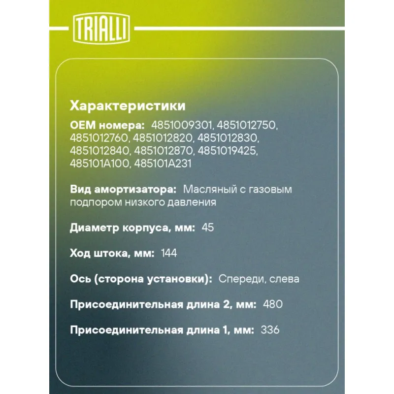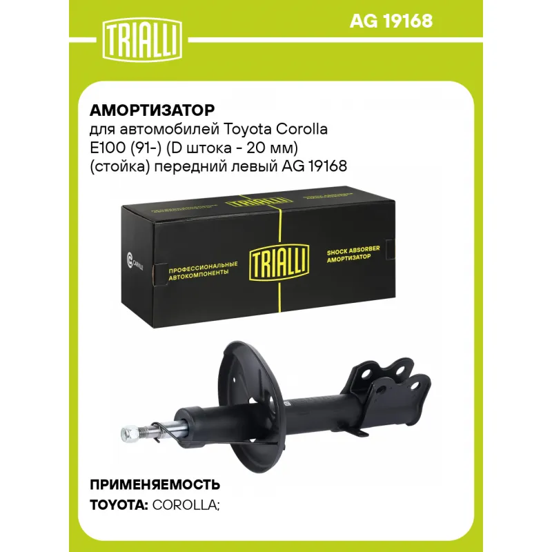 Амортизатор для автомобилей Toyota Corolla E100 (91-) (D штока - 20 мм) (стойка) передний левый Описание: Амортизатор AG 19168 бренда TRIALLI – это устройство для гашения колебаний (демпфирования) и поглощения толчков и ударов, действующих на раму. Особенности AG 19168: - Вид – Масляный с газовым подпором низкого давления; - Тип – Двухтрубный, гидравлический; Для крепления к деталям кузова или подвески используются крепления: верхнее Шток M14x1,5; и нижнее Скоба. Амортизатор в машину (стойка) имеет специальную площадку для установки пружины подвески. Совместим с: TOYOTA COROLLA.Подбор по VIN-номеру вашего автомобиля - через кнопку 'Задать вопрос'. Специалист проверит применяемость и ответит вам. Преимущества: - Инновационная технология производства; - Контроль качества каждой позиции по чертежам и с помощью 3D модели; - Сальник NOK; - Высокоэффективная система проектирования; - Гарантия до двух лет или 60 000 км пробега; Амортизаторы автомобильные существенно влияют на комфорт вождения, сокращая вибрации от неровностей дороги, что делает поездку более плавной и приятной. Регулярное и своевременное обслуживание амортизаторов помогут продлить их срок службы и обеспечить надёжную работу. Характеристики: Артикул: AG 19168 OEM номера: 4851009301, 4851012750, 4851012760, 4851012820, 4851012830, 4851012840, 4851012870, 4851019425, 485101A100, 485101A231 Товарная линейка: BLACK Парный товар: AG 19369 Количество на автомобиль: 1 Вид амортизатора: Масляный с газовым подпором низкого давления Тип верхнего крепления: Шток Тип нижнего крепления: Скоба Диаметр корпуса, мм: 45 Диаметр штока, мм: 20 Ход штока, мм: 144 Размер резьбы штока: M14x1,5 Тип амортизатора: Двухтрубный, гидравлический Ось (сторона установки): Спереди, слева Дополнительная информация: Упаковка изделия может отличаться от представленной на фото Присоединительная длина 2, мм: 480 Присоединительная длина 1, мм: 336 Сопутствующий товар: Амортизаторы: AG 19369 Гарантийный срок: 2 года/60 000 км Комплектация: Амортизатор (стойка) передний - 1 шт Гайка крепежная - 1 шт Гарантия: от 1 года.