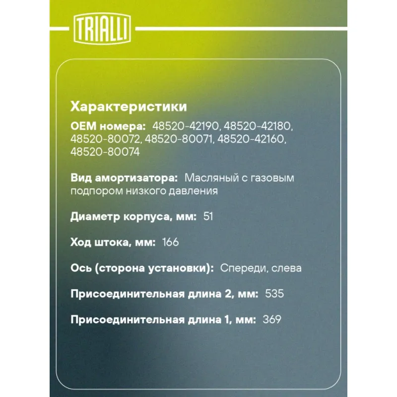 Амортизатор для автомобилей Toyota RAV4 (05-) (стойка) передний левый Описание: Амортизатор AG 19160 бренда TRIALLI – это устройство для гашения колебаний (демпфирования) и поглощения толчков и ударов, действующих на раму. Особенности AG 19160: - Вид – Масляный с газовым подпором низкого давления; - Тип – Двухтрубный, гидравлический; Для крепления к деталям кузова или подвески используются крепления: верхнее Шток M14x1.5; и нижнее Скоба. Амортизатор в машину (стойка) имеет специальную площадку для установки пружины подвески. Совместим с: TOYOTA RAV 4.Подбор по VIN-номеру вашего автомобиля - через кнопку 'Задать вопрос'. Специалист проверит применяемость и ответит вам. Преимущества: - Инновационная технология производства; - Контроль качества каждой позиции по чертежам и с помощью 3D модели; - Сальник NOK; - Высокоэффективная система проектирования; - Гарантия до двух лет или 60 000 км пробега; Амортизаторы автомобильные существенно влияют на комфорт вождения, сокращая вибрации от неровностей дороги, что делает поездку более плавной и приятной. Регулярное и своевременное обслуживание амортизаторов помогут продлить их срок службы и обеспечить надёжную работу. Характеристики: Артикул: AG 19160 OEM номера: 48520-42190, 48520-42180, 48520-80072, 48520-80071, 48520-42160, 48520-80074 Товарная линейка: BLACK Парный товар: AG 19361 Количество на автомобиль: 1 Вид амортизатора: Масляный с газовым подпором низкого давления Тип верхнего крепления: Шток Тип нижнего крепления: Скоба Диаметр корпуса, мм: 51 Диаметр штока, мм: 22 Ход штока, мм: 166 Размер резьбы штока: M14x1.5 Тип амортизатора: Двухтрубный, гидравлический Ось (сторона установки): Спереди, слева Дополнительная информация: Упаковка изделия может отличаться от представленной на фото Присоединительная длина 2, мм: 535 Присоединительная длина 1, мм: 369 Сопутствующий товар: Ремонтные комплекты амортизаторов: BC 1948, BCS 2048 Сопутствующий товар: Амортизаторы: AG 19361,AG 19507 Гарантийный срок: 2 года/60 000 км Подходит для авто: Toyota RAV 4 (06-), RAV 4 (06-) Для проверки применяемости отправьте VIN автомобиля через вкладку "Есть вопросы о товаре?" Комплектация: Амортизатор (стойка) передний - 1 шт Гайка крепежная - 1 шт Гарантия: от 1 года.