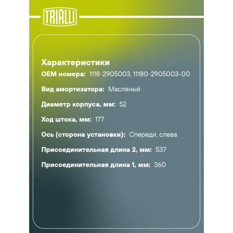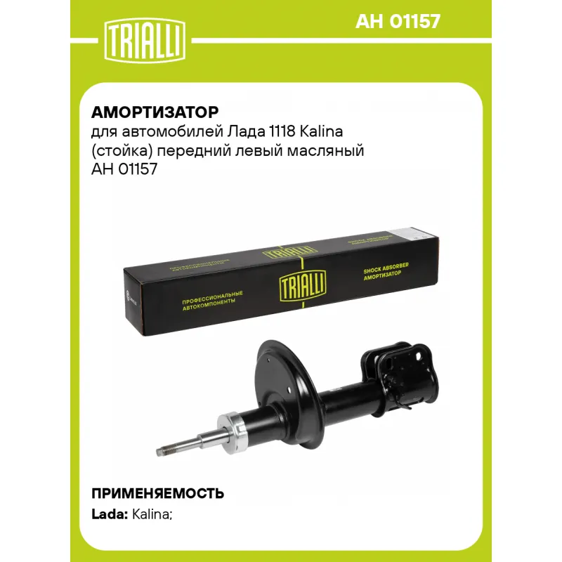 Амортизатор для автомобилей Лада 1118 Kalina (стойка) передний левый масляный Описание: Амортизатор AH 01157 бренда TRIALLI служит для гашения колебаний (демпфирования) и поглощения толчков и ударов, действующих на кузов (раму) автомобиля. Особенности AH 01157: - Вид амортизатора – Масляный; - Тип амортизатора – Двухтрубный, гидравлический; Для крепления к деталям кузова автомобиля или подвески используется - верхнее крепление Шток M14x1.5; и нижнее крепление - Скоба. Амортизатор в машину (стойка) отличается от обычного амортизатора наличием специальной площадки для установки пружины подвески. Применяемость: LADA KALINA..Подбор по VIN-номеру вашего автомобиля - через кнопку 'Задать вопрос'. Специалист проверит применяемость и ответит вам. Преимущества: - Инновационная технология производства; - Контроль качества: - Дополнительная проверка с помощью 3D модели; - Сальник NOK; - Проверка каждой позиции по чертежам; - Высокоэффективная система проектирования; Амортизаторы автомобильные существенно влияют на комфорт вождения, поглощая удары и вибрации от неровностей дороги, что делает поездку более плавной и приятной.Регулярная проверка и своевременное обслуживание амортизаторов помогут продлить их срок службы и обеспечить надёжную работу. Характеристики: Артикул: AH 01157 OEM номера: 1118-2905003, 11180-2905003-00 Товарная линейка: BLACK Парный товар: AH 01358 Количество на автомобиль: 1 Вид амортизатора: Масляный Тип верхнего крепления: Шток Тип нижнего крепления: Скоба Диаметр корпуса, мм: 52 Диаметр штока, мм: 22 Ход штока, мм: 177 Размер резьбы штока: M14x1.5 Тип амортизатора: Двухтрубный, гидравлический Ось (сторона установки): Спереди, слева Дополнительная информация: Для а/м с коническими пружинами Присоединительная длина 2, мм: 537 Сопутствующий товар: Опоры передних стоек: SA 504 Присоединительная длина 1, мм: 360 Сопутствующий товар: Ремонтные комплекты амортизаторов: BC 0103, BC 0133, BCS 0103, BCS 0136, BC 1966, BCS 2066,BCS 0106, BC 0184, BC 0154, BCS 0133 Сопутствующий товар: Амортизаторы: AG 01157, AH 01358,AG 01356, AH 01504, AH 01356, AG 01155, AG 01504, AH 01155, AG 01358 Гарантийный срок: 2 года/60 000 км Подходит для авто: ВАЗ Kalina (04-), Kalina (04-), Kalina (04-) Для проверки применяемости отправьте VIN автомобиля через вкладку "Есть вопросы о товаре?" Комплектация: Амортизатор (стойка) передний - 1 шт Гайка крепежная - 1 шт Гарантия: от 1 года.