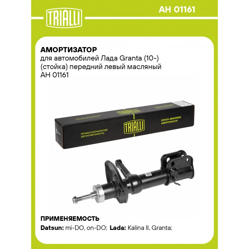 Амортизатор для автомобилей Лада Granta (10-) (стойка) передний левый масляный Описание: Амортизатор AH 01161 бренда TRIALLI служит для гашения колебаний (демпфирования) и поглощения толчков и ударов, действующих на кузов (раму) автомобиля. Особенности AH 01161: - Вид амортизатора – Масляный; - Тип амортизатора – Двухтрубный, гидравлический; Для крепления к деталям кузова автомобиля или подвески используется - верхнее крепление Шток M14x1.5; и нижнее крепление - Скоба. Амортизатор в машину (стойка) отличается от обычного амортизатора наличием специальной площадки для установки пружины подвески. Применяемость: DATSUN on-DO, mi-DO, LADA GRANTA, KALINA..Подбор по VIN-номеру вашего автомобиля - через кнопку 'Задать вопрос'. Специалист проверит применяемость и ответит вам. Преимущества: - Инновационная технология производства; - Контроль качества: - Дополнительная проверка с помощью 3D модели; - Сальник NOK; - Проверка каждой позиции по чертежам; - Высокоэффективная система проектирования; Амортизаторы автомобильные существенно влияют на комфорт вождения, поглощая удары и вибрации от неровностей дороги, что делает поездку более плавной и приятной.Регулярная проверка и своевременное обслуживание амортизаторов помогут продлить их срок службы и обеспечить надёжную работу. Характеристики: Артикул: AH 01161 OEM номера: 2190-2905003, 54303-5PA1B, 21900-2905003-00 Товарная линейка: BLACK Парный товар: AH 01362 Количество на автомобиль: 1 Вид амортизатора: Масляный Тип верхнего крепления: Шток Тип нижнего крепления: Скоба Диаметр корпуса, мм: 52 Диаметр штока, мм: 22 Ход штока, мм: 171 Размер резьбы штока: M14x1.5 Тип амортизатора: Двухтрубный, гидравлический Ось (сторона установки): Спереди, слева Дополнительная информация: Упаковка изделия может отличаться от представленной на фото Присоединительная длина 2, мм: 514 Сопутствующий товар: Опоры передних стоек: SA 0155, SA 0156 Присоединительная длина 1, мм: 343 Сопутствующий товар: Ремонтные комплекты амортизаторов: BC 0102, BC 0132, BC 0110, BCS 0102, BCS 0132, BC 1948, BC 1966, BCS 2066,BC 0187, BCS 0103, BC 0154, BC 0157 Сопутствующий товар: Амортизаторы: AG 01161, AH 01362,AH 01510, AG 01362, AG 01510, AG 01517, AG 01168, AG 01369 Гарантийный срок: 2 года/60 000 км Подходит для авто: Datsun mi-DO (15-), on-DO (14-) ВАЗ Kalina II (13-), Granta (10-) Для проверки применяемости отправьте VIN автомобиля через вкладку "Есть вопросы о товаре?" Комплектация: Амортизатор (стойка) передний - 1 шт Гайка крепежная - 1 шт Гарантия: от 1 года.