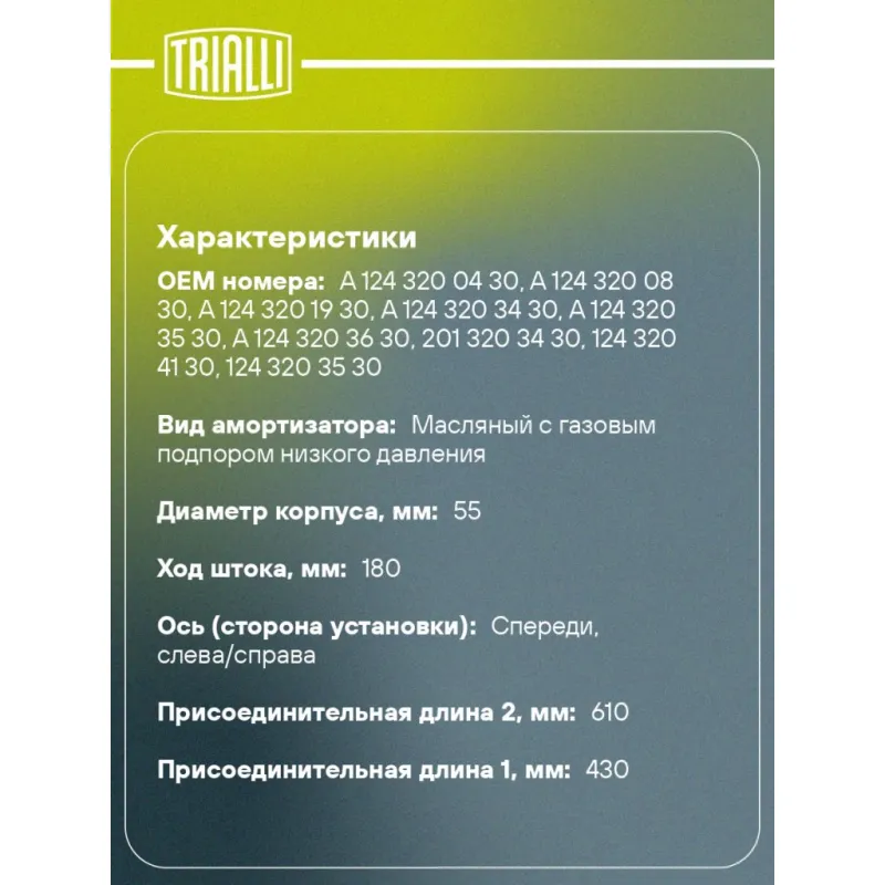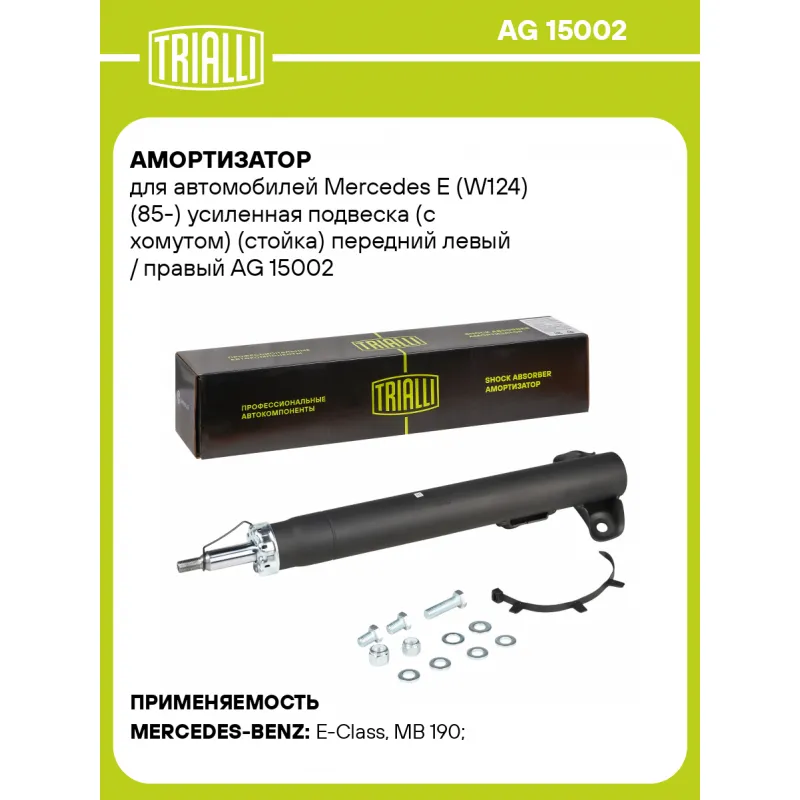 Амортизатор для автомобилей Mercedes E (W124) (85-) усиленная подвеска (с хомутом) (стойка) передний левый / правый Описание: Амортизатор AG 15002 бренда TRIALLI – это устройство для гашения колебаний (демпфирования) и поглощения толчков и ударов, действующих на раму. Особенности AG 15002: - Вид – Масляный с газовым подпором низкого давления; - Тип – Двухтрубный, гидравлический; Для крепления к деталям кузова или подвески используются крепления: верхнее Шток M14x1,5; и нижнее Зажим. Амортизатор в машину (стойка) имеет специальную площадку для установки пружины подвески. Совместим с: MERCEDES-BENZ E-Class, 190.Подбор по VIN-номеру вашего автомобиля - через кнопку 'Задать вопрос'. Специалист проверит применяемость и ответит вам. Преимущества: - Инновационная технология производства; - Контроль качества каждой позиции по чертежам и с помощью 3D модели; - Сальник NOK; - Высокоэффективная система проектирования; - Гарантия до двух лет или 60 000 км пробега; Амортизаторы автомобильные существенно влияют на комфорт вождения, сокращая вибрации от неровностей дороги, что делает поездку более плавной и приятной. Регулярное и своевременное обслуживание амортизаторов помогут продлить их срок службы и обеспечить надёжную работу. Характеристики: Артикул: AG 15002 OEM номера: A 124 320 04 30, A 124 320 08 30, A 124 320 19 30, A 124 320 34 30, A 124 320 35 30, A 124 320 36 30, 201 320 34 30, 124 320 41 30, 124 320 35 30, 124 320 42 30, A 124 320 34 30 64, 124 320 19 30, 201 320 39 30, 124 320 08 30, 124 320 64 30, 124 320 56 30, 201 320 11 30, 201 320 44 30, 201 320 13 30, 124 320 04 30, 124 320 36 30, 124 320 60 30, 124 320 34 30, A 201 320 11 30, A 201 320 13 30, A 201 320 34 30, A 201 320 39 30, A 201 320 44 30, 124 320 55 30, A 124 320 41 30, A 124 320 42 30, A 124 320 55 30, A 124 320 56 30, A 124 320 60 30, A 124 320 64 30 Ход штока, мм: 180 Ось (сторона установки): Спереди, слева/справа Тип амортизатора: Двухтрубный, гидравлический Вид амортизатора: Масляный с газовым подпором низкого давления Тип верхнего крепления: Шток Тип нижнего крепления: Зажим Диаметр корпуса, мм: 55 Диаметр штока, мм: 22 Размер резьбы штока: M14x1,5 Присоединительная длина 1, мм: 430 Присоединительная длина 2, мм: 610 Сопутствующий товар: Амортизаторы: AG 15513 Товарная линейка: BLACK Количество на автомобиль: 2 Дополнительная информация: Упаковка изделия может отличаться от представленной на фото Гарантийный срок: 2 года/60 000 км Комплектация: Амортизатор (стойка) передний - 1 шт Гайка крепежная - 2 шт Хомут пластиковый - 1 шт Болт - 3 шт Шайба - 5 шт Гарантия: от 1 года.