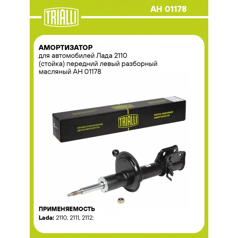Амортизатор для автомобилей Лада 2110 (стойка) передний левый разборный масляный Описание: Амортизатор AH 01178 бренда TRIALLI – это устройство для гашения колебаний (демпфирования) и поглощения толчков и ударов, действующих на раму. Особенности AH 01178: - Вид – Масляный; - Тип – Двухтрубный, гидравлический; Для крепления к деталям кузова или подвески используются крепления: верхнее Шток M14x1.5; и нижнее Скоба. Амортизатор в машину (стойка) имеет специальную площадку для установки пружины подвески. Совместим с: LADA ВАЗ 2110-2112.Подбор по VIN-номеру вашего автомобиля - через кнопку 'Задать вопрос'. Специалист проверит применяемость и ответит вам. Преимущества: - Инновационная технология производства; - Контроль качества каждой позиции по чертежам и с помощью 3D модели; - Сальник NOK; - Высокоэффективная система проектирования; - Гарантия до двух лет или 60 000 км пробега; Амортизаторы автомобильные существенно влияют на комфорт вождения, сокращая вибрации от неровностей дороги, что делает поездку более плавной и приятной. Регулярное и своевременное обслуживание амортизаторов помогут продлить их срок службы и обеспечить надёжную работу. Характеристики: Артикул: AH 01178 OEM номера: 2110-2905003, 21100-2905003-00 Товарная линейка: BLACK Парный товар: AH 01379 Количество на автомобиль: 1 Вид амортизатора: Масляный Тип верхнего крепления: Шток Тип нижнего крепления: Скоба Диаметр корпуса, мм: 52 Диаметр штока, мм: 22 Ход штока, мм: 167 Размер резьбы штока: M14x1.5 Тип амортизатора: Двухтрубный, гидравлический Ось (сторона установки): Спереди, слева Дополнительная информация: Разборная стойка Присоединительная длина 2, мм: 530 Сопутствующий товар: Опоры передних стоек: SA 0152 Присоединительная длина 1, мм: 363 Сопутствующий товар: Ремонтные комплекты амортизаторов: BC 0102, BC 0132, BC 0110, BCS 0102, BCS 0132, BC 1948, BCS 2048,BC 0152, BC 0182 Сопутствующий товар: Амортизаторы: AG 01178, AH 01379,AG 01504, AH 01504, AG 01379, AG 01354, AH 01091, AH 01153, AG 01153, AH 01354, AG 01091 Гарантийный срок: 2 года/60 000 км Подходит для авто: ВАЗ 2110, 2110, 2111, 2112, 2111, 2112 Для проверки применяемости отправьте VIN автомобиля через вкладку "Есть вопросы о товаре?" Комплектация: Гайка крепежная - 1 шт Амортизатор (стойка) передний - 1 шт Гарантия: от 1 года.