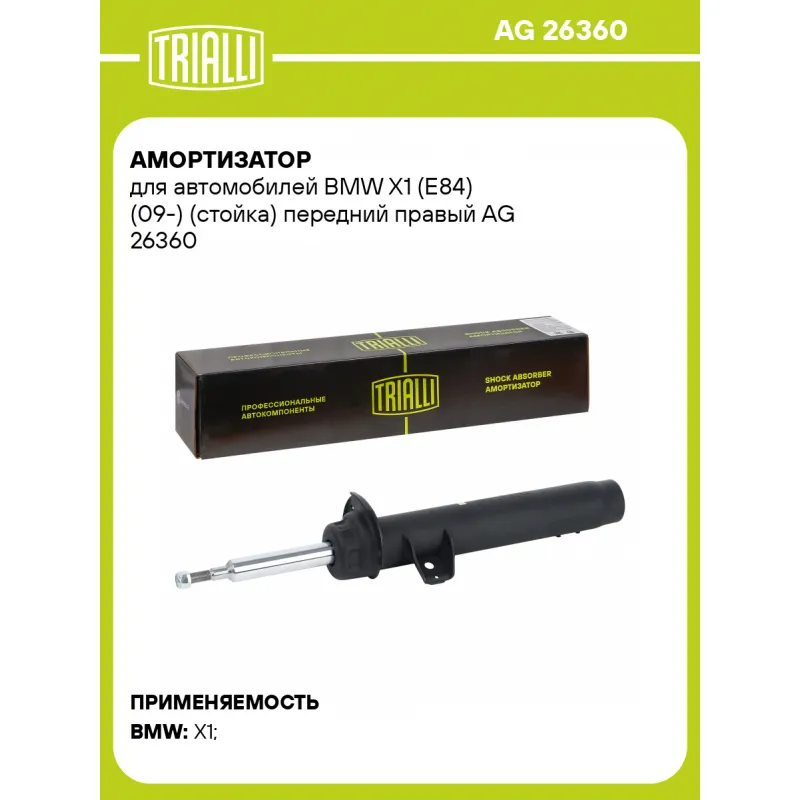 Амортизатор для автомобилей BMW X1 (E84) (09-) (стойка) передний правый Описание: Амортизатор AG 26360 бренда TRIALLI – это устройство для гашения колебаний (демпфирования) и поглощения толчков и ударов, действующих на раму. Особенности AG 26360: - Вид – Масляный с газовым подпором низкого давления; - Тип – Двухтрубный, гидравлический; Для крепления к деталям кузова или подвески используются крепления: верхнее Шток M12x1,5; и нижнее Зажим. Амортизатор в машину (стойка) имеет специальную площадку для установки пружины подвески. Совместим с: BMW X1.Подбор по VIN-номеру вашего автомобиля - через кнопку 'Задать вопрос'. Специалист проверит применяемость и ответит вам. Преимущества: - Инновационная технология производства; - Контроль качества каждой позиции по чертежам и с помощью 3D модели; - Сальник NOK; - Высокоэффективная система проектирования; - Гарантия до двух лет или 60 000 км пробега; Амортизаторы автомобильные существенно влияют на комфорт вождения, сокращая вибрации от неровностей дороги, что делает поездку более плавной и приятной. Регулярное и своевременное обслуживание амортизаторов помогут продлить их срок службы и обеспечить надёжную работу. Характеристики: Артикул: AG 26360 OEM номера: 31316789574, 31316851334, 31316789580, 31316851338 Товарная линейка: BLACK Парный товар: AG 26159 Количество на автомобиль: 1 Вид амортизатора: Масляный с газовым подпором низкого давления Тип верхнего крепления: Шток Тип нижнего крепления: Зажим Диаметр корпуса, мм: 58 Диаметр штока, мм: 25 Ход штока, мм: 157 Размер резьбы штока: M12x1,5 Тип амортизатора: Двухтрубный, гидравлический Ось (сторона установки): Спереди, справа Дополнительная информация: Упаковка изделия может отличаться от представленной на фото Присоединительная длина 2, мм: 525 Присоединительная длина 1, мм: 368 Сопутствующий товар: Амортизаторы: AG 26159, AG 26505 Гарантийный срок: 2 года/60 000 км Комплектация: Гайка крепежная - 1 шт Амортизатор (стойка) передний - 1 шт Гарантия: от 1 года.