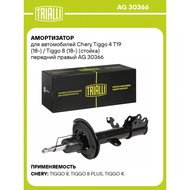 Амортизатор для автомобилей Chery Tiggo 4 T19 (18-) / Tiggo 8 (18-) (стойка) передний правый Описание: Амортизатор AG 30366 бренда TRIALLI – это устройство для гашения колебаний (демпфирования) и поглощения толчков и ударов, действующих на раму. Особенности AG 30366: - Вид – Масляный с газовым подпором низкого давления; - Тип – Двухтрубный, гидравлический; Для крепления к деталям кузова или подвески используются крепления: верхнее Шток M12x1,25; и нижнее Скоба. Амортизатор в машину (стойка) имеет специальную площадку для установки пружины подвески. Совместим с: CHERY TIGGO 8, TIGGO 4.Подбор по VIN-номеру вашего автомобиля - через кнопку 'Задать вопрос'. Специалист проверит применяемость и ответит вам. Преимущества: - Инновационная технология производства; - Контроль качества каждой позиции по чертежам и с помощью 3D модели; - Сальник NOK; - Высокоэффективная система проектирования; - Гарантия до двух лет или 60 000 км пробега; Амортизаторы автомобильные существенно влияют на комфорт вождения, сокращая вибрации от неровностей дороги, что делает поездку более плавной и приятной. Регулярное и своевременное обслуживание амортизаторов помогут продлить их срок службы и обеспечить надёжную работу. Характеристики: Артикул: AG 30366 OEM номера: 202000039AA, 20200037AA, 202000335AA Товарная линейка: BLACK Парный товар: AG 30165 Количество на автомобиль: 1 Вид амортизатора: Масляный с газовым подпором низкого давления Тип верхнего крепления: Шток Тип нижнего крепления: Скоба Диаметр корпуса, мм: 50 Диаметр штока, мм: 22 Ход штока, мм: 205 Размер резьбы штока: M12x1,25 Тип амортизатора: Двухтрубный, гидравлический Ось (сторона установки): Спереди, справа Дополнительная информация: Упаковка изделия может отличаться от представленной на фото Присоединительная длина 2, мм: 605 Присоединительная длина 1, мм: 400 Сопутствующий товар: Амортизаторы: AG 30165 Гарантийный срок: 2 года/60 000 км Комплектация: Гайка крепежная - 1 шт Амортизатор (стойка) передний - 1 шт Гарантия: от 1 года.