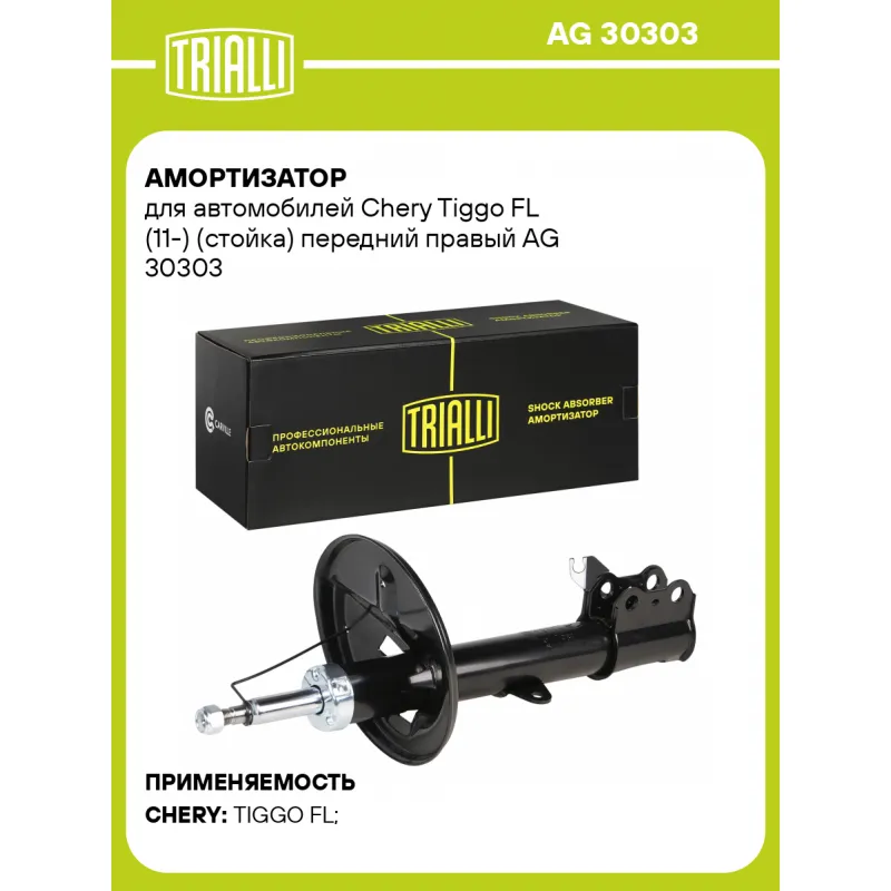 Амортизатор для автомобилей Chery Tiggo FL (11-) (стойка) передний правый Описание: Амортизатор AG 30303 бренда TRIALLI – это устройство для гашения колебаний (демпфирования) и поглощения толчков и ударов, действующих на раму. Особенности AG 30303: - Вид – Масляный с газовым подпором низкого давления; - Тип – Двухтрубный, гидравлический; Для крепления к деталям кузова или подвески используются крепления: верхнее Шток M14x1,5; и нижнее Скоба. Амортизатор в машину (стойка) имеет специальную площадку для установки пружины подвески. Совместим с: CHERY TIGGO.Подбор по VIN-номеру вашего автомобиля - через кнопку 'Задать вопрос'. Специалист проверит применяемость и ответит вам. Преимущества: - Инновационная технология производства; - Контроль качества каждой позиции по чертежам и с помощью 3D модели; - Сальник NOK; - Высокоэффективная система проектирования; - Гарантия до двух лет или 60 000 км пробега; Амортизаторы автомобильные существенно влияют на комфорт вождения, сокращая вибрации от неровностей дороги, что делает поездку более плавной и приятной. Регулярное и своевременное обслуживание амортизаторов помогут продлить их срок службы и обеспечить надёжную работу. Характеристики: Артикул: AG 30303 OEM номера: T212905020 Товарная линейка: BLACK Парный товар: AG 30103 Количество на автомобиль: 1 Вид амортизатора: Масляный с газовым подпором низкого давления Тип верхнего крепления: Шток Тип нижнего крепления: Скоба Диаметр корпуса, мм: 50 Диаметр штока, мм: 22 Ход штока, мм: 209 Размер резьбы штока: M14x1,5 Тип амортизатора: Двухтрубный, гидравлический Ось (сторона установки): Спереди, справа Дополнительная информация: Упаковка изделия может отличаться от представленной на фото Присоединительная длина 2, мм: 594 Присоединительная длина 1, мм: 385 Сопутствующий товар: Амортизаторы: AG 30103 Гарантийный срок: 2 года/60 000 км Комплектация: Амортизатор (стойка) передний - 1 шт Гайка крепежная - 1 шт Гарантия: от 1 года.