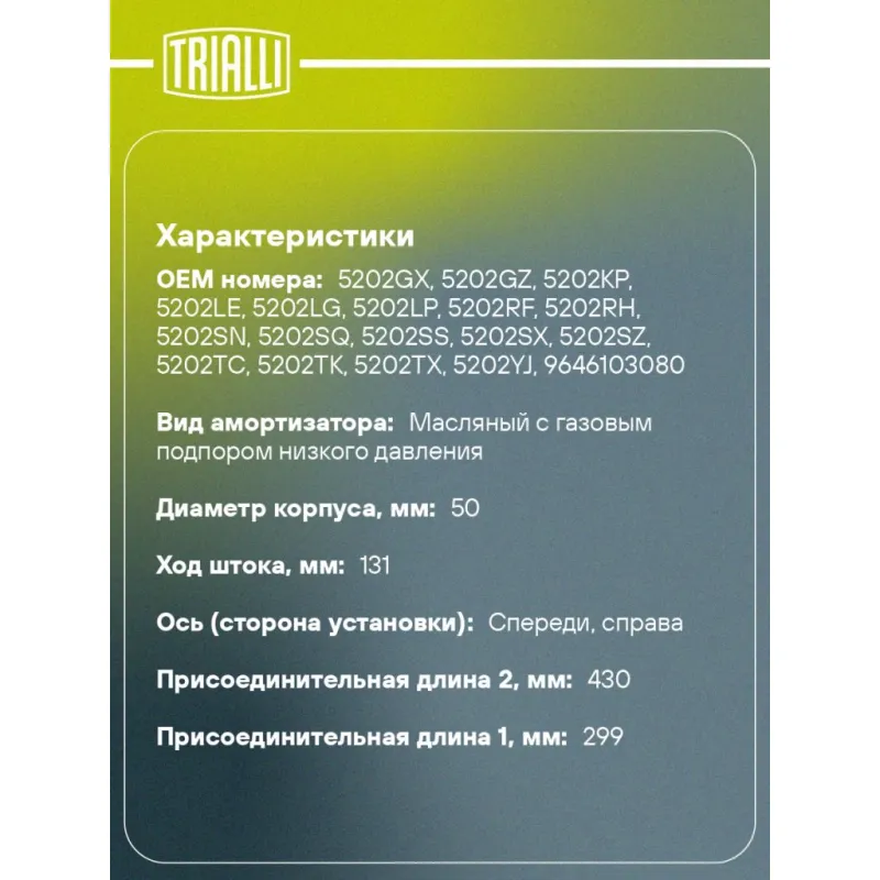 Амортизатор для автомобилей Citroen C3 (02-) (стойка) передний правый Описание: Амортизатор AG 20359 бренда TRIALLI – это устройство для гашения колебаний (демпфирования) и поглощения толчков и ударов, действующих на раму. Особенности AG 20359: - Вид – Масляный с газовым подпором низкого давления; - Тип – Двухтрубный, гидравлический; Для крепления к деталям кузова или подвески используются крепления: верхнее Шток M14x1.5; и нижнее Зажим. Амортизатор в машину (стойка) имеет специальную площадку для установки пружины подвески. Совместим с: CITROEN C3, C2, PEUGEOT 1007.Подбор по VIN-номеру вашего автомобиля - через кнопку 'Задать вопрос'. Специалист проверит применяемость и ответит вам. Преимущества: - Инновационная технология производства; - Контроль качества каждой позиции по чертежам и с помощью 3D модели; - Сальник NOK; - Высокоэффективная система проектирования; - Гарантия до двух лет или 60 000 км пробега; Амортизаторы автомобильные существенно влияют на комфорт вождения, сокращая вибрации от неровностей дороги, что делает поездку более плавной и приятной. Регулярное и своевременное обслуживание амортизаторов помогут продлить их срок службы и обеспечить надёжную работу. Характеристики: Артикул: AG 20359 OEM номера: 5202GX, 5202GZ, 5202KP, 5202LE, 5202LG, 5202LP, 5202RF, 5202RH, 5202SN, 5202SQ, 5202SS, 5202SX, 5202SZ, 5202TC, 5202TK, 5202TX, 5202YJ, 9646103080, 9646492180, 9649125780, 9649126180, 9649468580, 9650805480, 9650805680 Товарная линейка: BLACK Парный товар: AG 20158 Количество на автомобиль: 1 Вид амортизатора: Масляный с газовым подпором низкого давления Тип верхнего крепления: Шток Тип нижнего крепления: Зажим Диаметр корпуса, мм: 50 Диаметр штока, мм: 22 Ход штока, мм: 131 Размер резьбы штока: M14x1.5 Тип амортизатора: Двухтрубный, гидравлический Ось (сторона установки): Спереди, справа Дополнительная информация: Упаковка изделия может отличаться от представленной на фото Присоединительная длина 2, мм: 430 Присоединительная длина 1, мм: 299 Сопутствующий товар: Ремонтные комплекты амортизаторов: BC 1948, BCS 2048 Сопутствующий товар: Амортизаторы: AG 20158, AG 20505 Гарантийный срок: 2 года/60 000 км Подходит для авто: Citroen C3 (02-), C2 (03-) Peugeot 1007 (05-) Для проверки применяемости отправьте VIN автомобиля через вкладку "Есть вопросы о товаре?" Комплектация: Амортизатор (стойка) передний - 1 шт Гайка крепежная - 1 шт Гарантия: от 1 года.