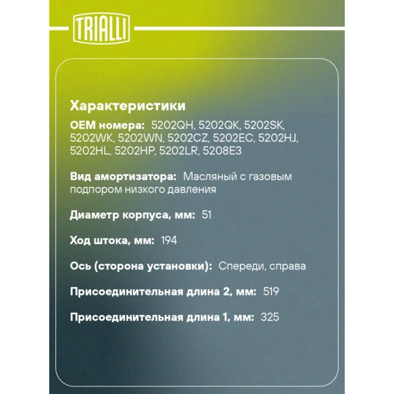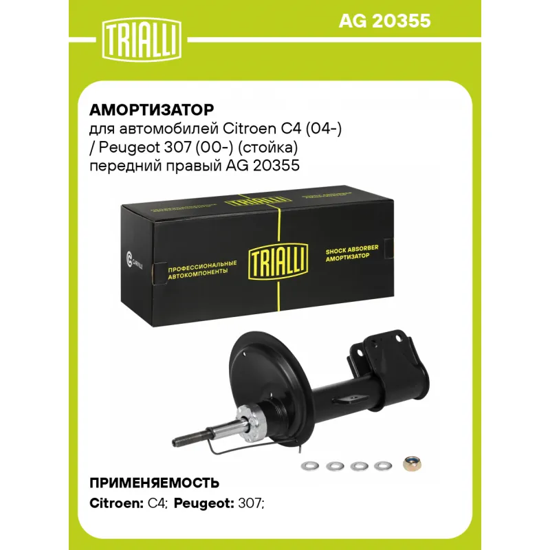 Амортизатор для автомобилей Citroen C4 (04-) / Peugeot 307 (00-) (стойка) передний правый Описание: Амортизатор AG 20355 бренда TRIALLI – это устройство для гашения колебаний (демпфирования) и поглощения толчков и ударов, действующих на раму. Особенности AG 20355: - Вид – Масляный с газовым подпором низкого давления; - Тип – Двухтрубный, гидравлический; Для крепления к деталям кузова или подвески используются крепления: верхнее Шток M14x1.5; и нижнее Скоба. Амортизатор в машину (стойка) имеет специальную площадку для установки пружины подвески. Совместим с: CITROEN C4, PEUGEOT 307.Подбор по VIN-номеру вашего автомобиля - через кнопку 'Задать вопрос'. Специалист проверит применяемость и ответит вам. Преимущества: - Инновационная технология производства; - Контроль качества каждой позиции по чертежам и с помощью 3D модели; - Сальник NOK; - Высокоэффективная система проектирования; - Гарантия до двух лет или 60 000 км пробега; Амортизаторы автомобильные существенно влияют на комфорт вождения, сокращая вибрации от неровностей дороги, что делает поездку более плавной и приятной. Регулярное и своевременное обслуживание амортизаторов помогут продлить их срок службы и обеспечить надёжную работу. Характеристики: Артикул: AG 20355 OEM номера: 5202QH, 5202QK, 5202SK, 5202WK, 5202WN, 5202CZ, 5202EC, 5202HJ, 5202HL, 5202HP, 5202LR, 5208E3 Товарная линейка: BLACK Парный товар: AG 20154 Количество на автомобиль: 1 Вид амортизатора: Масляный с газовым подпором низкого давления Тип верхнего крепления: Шток Тип нижнего крепления: Скоба Диаметр корпуса, мм: 51 Диаметр штока, мм: 20 Ход штока, мм: 194 Размер резьбы штока: M14x1.5 Тип амортизатора: Двухтрубный, гидравлический Ось (сторона установки): Спереди, справа Дополнительная информация: Упаковка изделия может отличаться от представленной на фото Присоединительная длина 2, мм: 519 Сопутствующий товар: Опоры передних стоек: SA 2054, SA 2058 Присоединительная длина 1, мм: 325 Сопутствующий товар: Ремонтные комплекты амортизаторов: BC 1866, BCS 1866 Сопутствующий товар: Амортизаторы: AG 20154, AG 20503 Гарантийный срок: 2 года/60 000 км Подходит для авто: Citroen C4 (04-) Peugeot 307 (00-) Для проверки применяемости отправьте VIN автомобиля через вкладку "Есть вопросы о товаре?" Комплектация: Амортизатор (стойка) передний - 1 шт Гайка крепежная - 1 шт Гарантия: от 1 года.