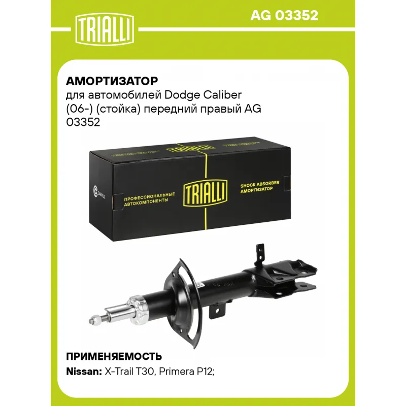 Амортизатор для автомобилей Dodge Caliber (06-) (стойка) передний правый Описание: Амортизатор AG 03352 бренда TRIALLI – это устройство для гашения колебаний (демпфирования) и поглощения толчков и ударов, действующих на раму. Особенности AG 03352: - Вид – Масляный с газовым подпором низкого давления; - Тип – Двухтрубный, гидравлический; Для крепления к деталям кузова или подвески используются крепления: верхнее Шток M12x1.25; и нижнее Скоба. Амортизатор в машину (стойка) имеет специальную площадку для установки пружины подвески. Совместим с: DODGE CALIBER, NISSAN PRIMERA, X-TRAIL.Подбор по VIN-номеру вашего автомобиля - через кнопку 'Задать вопрос'. Специалист проверит применяемость и ответит вам. Преимущества: - Инновационная технология производства; - Контроль качества каждой позиции по чертежам и с помощью 3D модели; - Сальник NOK; - Высокоэффективная система проектирования; - Гарантия до двух лет или 60 000 км пробега; Амортизаторы автомобильные существенно влияют на комфорт вождения, сокращая вибрации от неровностей дороги, что делает поездку более плавной и приятной. Регулярное и своевременное обслуживание амортизаторов помогут продлить их срок службы и обеспечить надёжную работу. Характеристики: Артикул: AG 03352 OEM номера: 5105310AF, 5105310AG, 5105310AH Товарная линейка: BLACK Парный товар: AG 03151 Количество на автомобиль: 1 Вид амортизатора: Масляный с газовым подпором низкого давления Тип верхнего крепления: Шток Тип нижнего крепления: Скоба Диаметр корпуса, мм: 51 Диаметр штока, мм: 22 Ход штока, мм: 166 Размер резьбы штока: M12x1.25 Тип амортизатора: Двухтрубный, гидравлический Ось (сторона установки): Спереди, справа Присоединительная длина 2, мм: 584 Присоединительная длина 1, мм: 418 Сопутствующий товар: Ремонтные комплекты амортизаторов: BC 1948, BCS 2048 Сопутствующий товар: Амортизаторы: AG 03151, AG 03517 Гарантийный срок: 2 года/60 000 км Подходит для авто: Nissan X-Trail T30 (01-), Primera P12 (02-), X-Trail T30 (01-), Primera P12 (02-) Для проверки применяемости отправьте VIN автомобиля через вкладку "Есть вопросы о товаре?" Комплектация: Амортизатор (стойка) передний - 1 шт Гайка крепежная - 1 шт Гарантия: от 1 года.