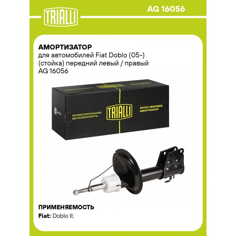 Амортизатор для автомобилей Fiat Doblo (05-) (стойка) передний левый / правый Описание: Амортизатор AG 16056 бренда TRIALLI – это устройство для гашения колебаний (демпфирования) и поглощения толчков и ударов, действующих на раму. Особенности AG 16056: - Вид – Масляный с газовым подпором низкого давления; - Тип – Двухтрубный, гидравлический; Для крепления к деталям кузова или подвески используются крепления: верхнее Шток M12x1.25; и нижнее Скоба. Амортизатор в машину (стойка) имеет специальную площадку для установки пружины подвески. Совместим с: FIAT DOBLO.Подбор по VIN-номеру вашего автомобиля - через кнопку 'Задать вопрос'. Специалист проверит применяемость и ответит вам. Преимущества: - Инновационная технология производства; - Контроль качества каждой позиции по чертежам и с помощью 3D модели; - Сальник NOK; - Высокоэффективная система проектирования; - Гарантия до двух лет или 60 000 км пробега; Амортизаторы автомобильные существенно влияют на комфорт вождения, сокращая вибрации от неровностей дороги, что делает поездку более плавной и приятной. Регулярное и своевременное обслуживание амортизаторов помогут продлить их срок службы и обеспечить надёжную работу. Характеристики: Артикул: AG 16056 OEM номера: 51755247, 51755205 Товарная линейка: BLACK Количество на автомобиль: 2 Вид амортизатора: Масляный с газовым подпором низкого давления Тип верхнего крепления: Шток Тип нижнего крепления: Скоба Диаметр корпуса, мм: 52 Диаметр штока, мм: 22 Ход штока, мм: 168 Размер резьбы штока: M12x1.25 Тип амортизатора: Двухтрубный, гидравлический Ось (сторона установки): Спереди, слева/справа Дополнительная информация: Упаковка изделия может отличаться от представленной на фото Присоединительная длина 2, мм: 557±3 Присоединительная длина 1, мм: 389±3 Сопутствующий товар: Амортизаторы: AG 16513 Гарантийный срок: 2 года/60 000 км Подходит для авто: Fiat Doblo II (09-) Для проверки применяемости отправьте VIN автомобиля через вкладку "Есть вопросы о товаре?" Комплектация: Амортизатор (стойка) передний - 1 шт Гайка крепежная - 1 шт Гарантия: от 1 года.