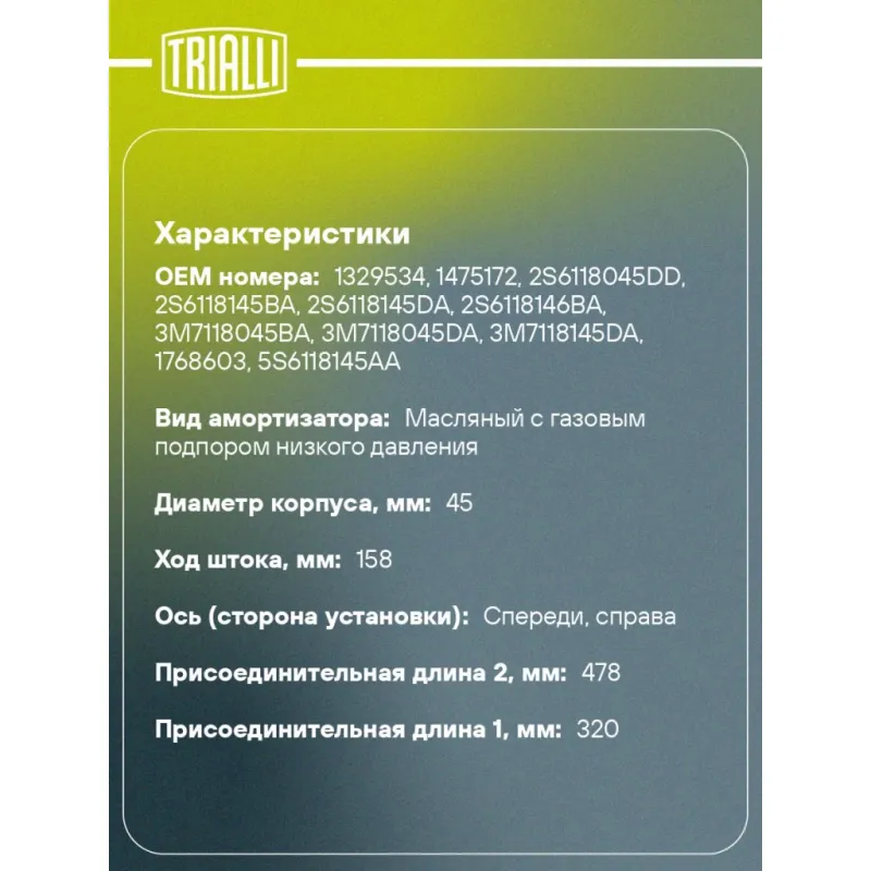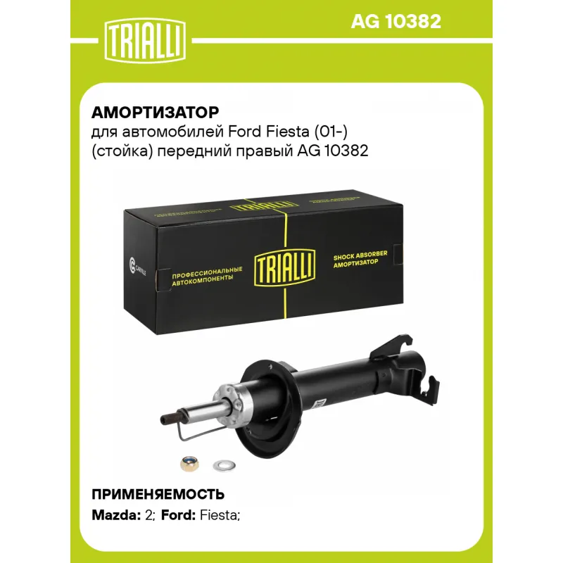 Амортизатор для автомобилей Ford Fiesta (01-) (стойка) передний правый Описание: Амортизатор AG 10382 бренда TRIALLI – это устройство для гашения колебаний (демпфирования) и поглощения толчков и ударов, действующих на раму. Особенности AG 10382: - Вид – Масляный с газовым подпором низкого давления; - Тип – Двухтрубный, гидравлический; Для крепления к деталям кузова или подвески используются крепления: верхнее Шток M12x1.25; и нижнее Зажим. Амортизатор в машину (стойка) имеет специальную площадку для установки пружины подвески. Совместим с: FORD FIESTA, MAZDA 2.Подбор по VIN-номеру вашего автомобиля - через кнопку 'Задать вопрос'. Специалист проверит применяемость и ответит вам. Преимущества: - Инновационная технология производства; - Контроль качества каждой позиции по чертежам и с помощью 3D модели; - Сальник NOK; - Высокоэффективная система проектирования; - Гарантия до двух лет или 60 000 км пробега; Амортизаторы автомобильные существенно влияют на комфорт вождения, сокращая вибрации от неровностей дороги, что делает поездку более плавной и приятной. Регулярное и своевременное обслуживание амортизаторов помогут продлить их срок службы и обеспечить надёжную работу. Характеристики: Артикул: AG 10382 OEM номера: 1329534, 1475172, 2S6118045DD, 2S6118145BA, 2S6118145DA, 2S6118146BA, 3M7118045BA, 3M7118045DA, 3M7118145DA, 1768603, 5S6118145AA Товарная линейка: BLACK Парный товар: AG 10181 Количество на автомобиль: 1 Вид амортизатора: Масляный с газовым подпором низкого давления Тип верхнего крепления: Шток Тип нижнего крепления: Зажим Диаметр корпуса, мм: 45 Диаметр штока, мм: 20 Ход штока, мм: 158 Размер резьбы штока: M12x1.25 Тип амортизатора: Двухтрубный, гидравлический Ось (сторона установки): Спереди, справа Дополнительная информация: Для а/м с бочкообразными пружинами от 01.04 г.в. Присоединительная длина 2, мм: 478 Присоединительная длина 1, мм: 320 Сопутствующий товар: Ремонтные комплекты амортизаторов: BC 1848, BCS 1848,BCS 1884 Сопутствующий товар: Амортизаторы: AG 10181, AG 10520 Гарантийный срок: 2 года/60 000 км Подходит для авто: Mazda 2 (03-), 2 (03-) Ford Fiesta (01-), Fiesta (01-) Для проверки применяемости отправьте VIN автомобиля через вкладку "Есть вопросы о товаре?" Комплектация: Амортизатор (стойка) передний - 1 шт Гайка крепежная - 1 шт Гарантия: от 1 года.