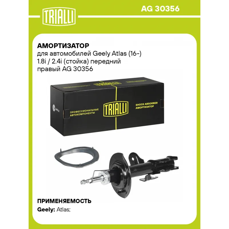 Амортизатор для автомобилей Geely Atlas (16-) 1.8i / 2.4i (стойка) передний правый Описание: Амортизатор AG 30356 бренда TRIALLI – это устройство для гашения колебаний (демпфирования) и поглощения толчков и ударов, действующих на раму. Особенности AG 30356: - Вид – Масляный с газовым подпором низкого давления; - Тип – Двухтрубный, гидравлический; Для крепления к деталям кузова или подвески используются крепления: верхнее Шток M12x1.25; и нижнее Скоба. Амортизатор в машину (стойка) имеет специальную площадку для установки пружины подвески. Совместим с: GEELY ATLAS.Подбор по VIN-номеру вашего автомобиля - через кнопку 'Задать вопрос'. Специалист проверит применяемость и ответит вам. Преимущества: - Инновационная технология производства; - Контроль качества каждой позиции по чертежам и с помощью 3D модели; - Сальник NOK; - Высокоэффективная система проектирования; - Гарантия до двух лет или 60 000 км пробега; Амортизаторы автомобильные существенно влияют на комфорт вождения, сокращая вибрации от неровностей дороги, что делает поездку более плавной и приятной. Регулярное и своевременное обслуживание амортизаторов помогут продлить их срок службы и обеспечить надёжную работу. Характеристики: Артикул: AG 30356 OEM номера: 4013005000, 4013036500, 4013004900, 4013036700 Товарная линейка: BLACK Парный товар: AG 30155 Количество на автомобиль: 1 Вид амортизатора: Масляный с газовым подпором низкого давления Тип верхнего крепления: Шток Тип нижнего крепления: Скоба Диаметр корпуса, мм: 50 Диаметр штока, мм: 22 Ход штока, мм: 176 Размер резьбы штока: M12x1.25 Тип амортизатора: Двухтрубный, гидравлический Ось (сторона установки): Спереди, справа Дополнительная информация: Упаковка изделия может отличаться от представленной на фото Присоединительная длина 2, мм: 557±3 Присоединительная длина 1, мм: 381±3 Сопутствующий товар: Амортизаторы: AG 30155 Гарантийный срок: 2 года/60 000 км Подходит для авто: Geely Atlas (16-) Для проверки применяемости отправьте VIN автомобиля через вкладку "Есть вопросы о товаре?" Комплектация: Амортизатор (стойка) передний - 1 шт Гайка крепежная - 1 шт Гарантия: от 1 года.