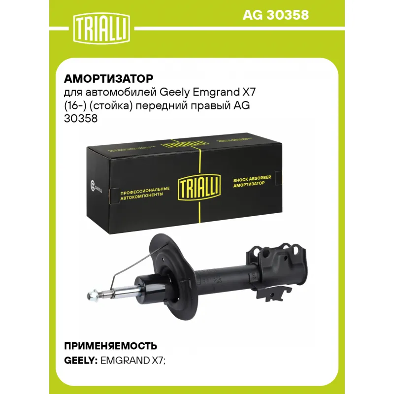 Амортизатор для автомобилей Geely Emgrand X7 (16-) (стойка) передний правый Описание: Амортизатор AG 30358 бренда TRIALLI – это устройство для гашения колебаний (демпфирования) и поглощения толчков и ударов, действующих на раму. Особенности AG 30358: - Вид – Масляный с газовым подпором низкого давления; - Тип – Двухтрубный, гидравлический; Для крепления к деталям кузова или подвески используются крепления: верхнее Шток M12x1,25; и нижнее Скоба. Амортизатор в машину (стойка) имеет специальную площадку для установки пружины подвески. Совместим с: GEELY EMGRAND X7.Подбор по VIN-номеру вашего автомобиля - через кнопку 'Задать вопрос'. Специалист проверит применяемость и ответит вам. Преимущества: - Инновационная технология производства; - Контроль качества каждой позиции по чертежам и с помощью 3D модели; - Сальник NOK; - Высокоэффективная система проектирования; - Гарантия до двух лет или 60 000 км пробега; Амортизаторы автомобильные существенно влияют на комфорт вождения, сокращая вибрации от неровностей дороги, что делает поездку более плавной и приятной. Регулярное и своевременное обслуживание амортизаторов помогут продлить их срок службы и обеспечить надёжную работу. Характеристики: Артикул: AG 30358 OEM номера: 1014027993, 1014027991, 1014029128 Товарная линейка: BLACK Парный товар: AG 30157 Количество на автомобиль: 1 Вид амортизатора: Масляный с газовым подпором низкого давления Тип верхнего крепления: Шток Тип нижнего крепления: Скоба Диаметр корпуса, мм: 51 Диаметр штока, мм: 22 Ход штока, мм: 186 Размер резьбы штока: M12x1,25 Тип амортизатора: Двухтрубный, гидравлический Ось (сторона установки): Спереди, справа Дополнительная информация: Упаковка изделия может отличаться от представленной на фото Присоединительная длина 2, мм: 551 Присоединительная длина 1, мм: 365 Сопутствующий товар: Амортизаторы: AG 30157 Гарантийный срок: 2 года/60 000 км Комплектация: Гайка крепежная - 1 шт Амортизатор (стойка) передний - 1 шт Гарантия: от 1 года.