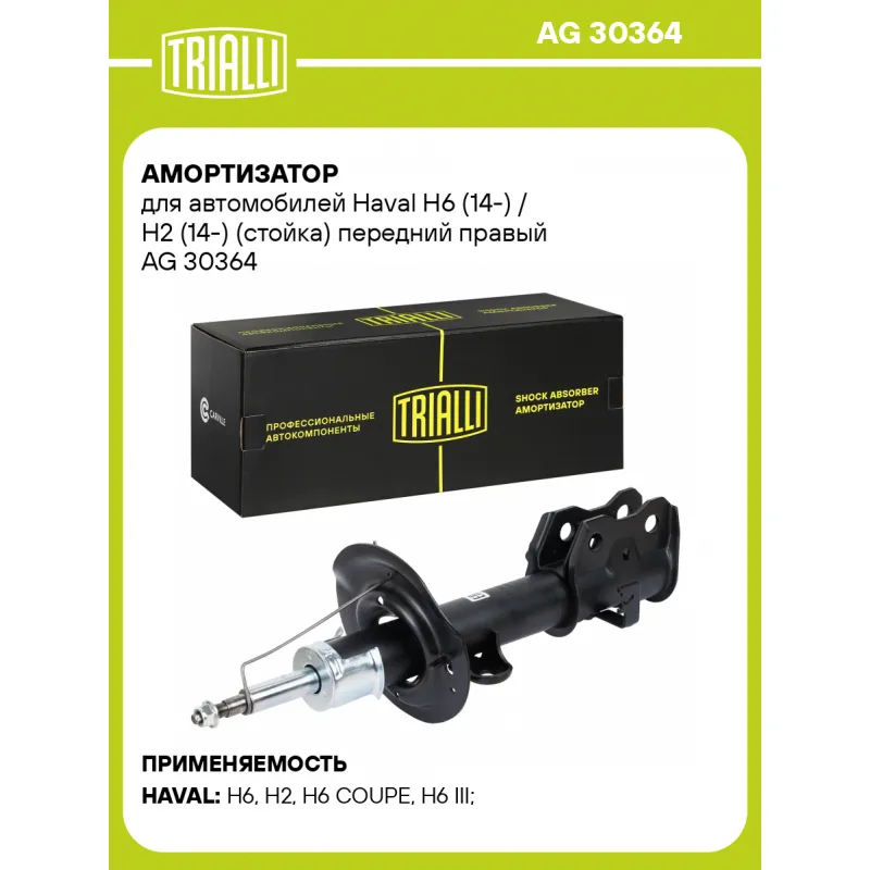 Амортизатор для автомобилей Haval H6 (14-) / H2 (14-) (стойка) передний правый Описание: Амортизатор AG 30364 бренда TRIALLI – это устройство для гашения колебаний (демпфирования) и поглощения толчков и ударов, действующих на раму. Особенности AG 30364: - Вид – Масляный с газовым подпором низкого давления; - Тип – Двухтрубный, гидравлический; Для крепления к деталям кузова или подвески используются крепления: верхнее Шток M12x1,25; и нижнее Скоба. Амортизатор в машину (стойка) имеет специальную площадку для установки пружины подвески. Совместим с: HAVAL H6, H2.Подбор по VIN-номеру вашего автомобиля - через кнопку 'Задать вопрос'. Специалист проверит применяемость и ответит вам. Преимущества: - Инновационная технология производства; - Контроль качества каждой позиции по чертежам и с помощью 3D модели; - Сальник NOK; - Высокоэффективная система проектирования; - Гарантия до двух лет или 60 000 км пробега; Амортизаторы автомобильные существенно влияют на комфорт вождения, сокращая вибрации от неровностей дороги, что делает поездку более плавной и приятной. Регулярное и своевременное обслуживание амортизаторов помогут продлить их срок службы и обеспечить надёжную работу. Характеристики: Артикул: AG 30364 OEM номера: 2905210XKZ70A, 2905220AKZ16A Товарная линейка: BLACK Парный товар: AG 30163 Количество на автомобиль: 1 Вид амортизатора: Масляный с газовым подпором низкого давления Тип верхнего крепления: Шток Тип нижнего крепления: Скоба Диаметр корпуса, мм: 51 Диаметр штока, мм: 22 Ход штока, мм: 163 Размер резьбы штока: M12x1,25 Тип амортизатора: Двухтрубный, гидравлический Ось (сторона установки): Спереди, справа Дополнительная информация: Упаковка изделия может отличаться от представленной на фото Присоединительная длина 2, мм: 564 Присоединительная длина 1, мм: 401 Сопутствующий товар: Амортизаторы: AG 30163 Гарантийный срок: 2 года/60 000 км Комплектация: Амортизатор (стойка) передний - 1 шт Гайка крепежная - 1 шт Гарантия: от 1 года.